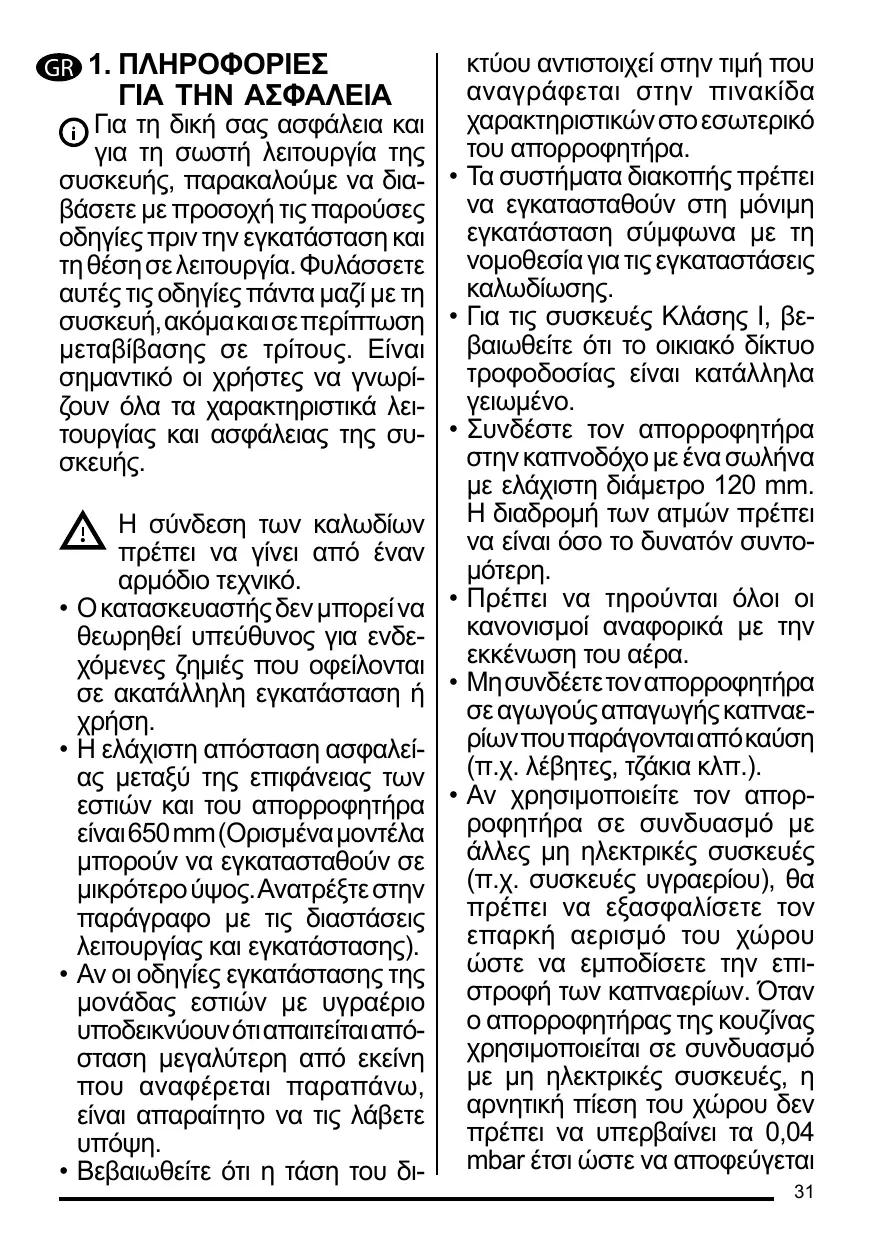 • Pour les appareils de Classe I, s’assurer que l’installation électrique de votre intérieur dispose d’une mise à la terre adéquate. Reliez l’aspirateur du conduit de cheminée avec un tube ayant un diamètre minimum de 120 mm. Le parcours des fumées doit être le plus court possible. Respecter toutes les normes concernant l’évacuation de l’air. Ne reliez pas la hotte aspirante aux conduits de cheminée qui acheminent les fumées de combustion (par ex. de chaudières, de cheminées, etc.). Si vous utilisez l’aspirateur en même temps que des appareils non électriques (par ex. fonctionnant au gaz), veillez à ce que la pièce soit adéquatement ventilée, afin d’empêcher le retour du flux des gaz d’évacuation. Si vous utilisez la hotte de cuisine en même temps que des appareils non alimentés à l’électricité, la pression négative dans la pièce ne doit pas dépasser 0,04 mbar, afin d’éviter que les fumées soient réaspirées dans la pièce où se trouve la hotte. Ne pas évacuer l’air à travers 15