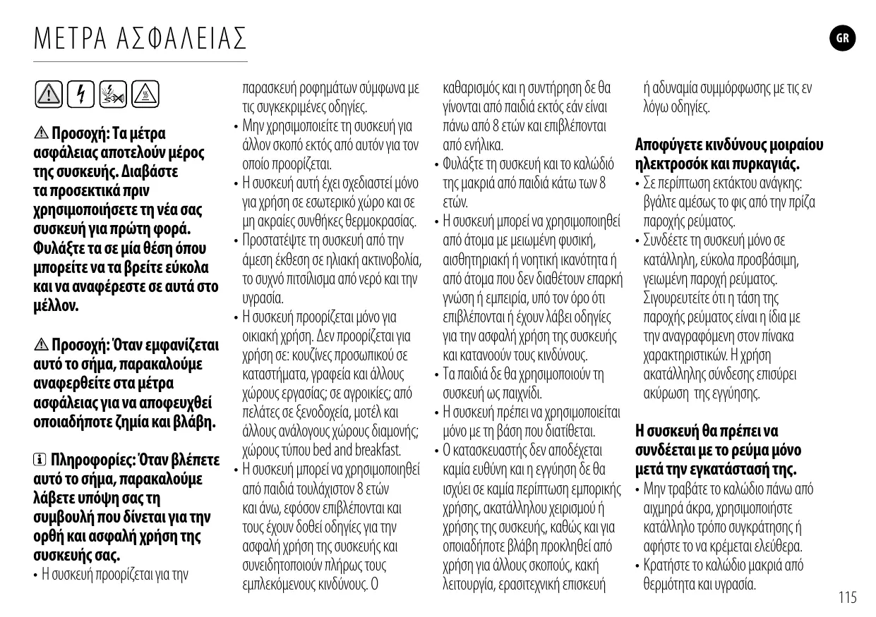 ΜΈΤΡΑ ΑΣΦΆΛΕΙΑΣ Προσοχή: Τα μέτρα ασφάλειας αποτελούν μέρος της συσκευής. Διαβάστε τα προσεκτικά πριν χρησιμοποιήσετε τη νέα σας συσκευή για πρώτη φορά. Φυλάξτε τα σε μία θέση όπου μπορείτε να τα βρείτε εύκολα και να αναφέρεστε σε αυτά στο μέλλον. Προσοχή: Όταν εμφανίζεται αυτό το σήμα, παρακαλούμε αναφερθείτε στα μέτρα ασφάλειας για να αποφευχθεί οποιαδήποτε ζημία και βλάβη. Πληροφορίες: Όταν βλέπετε αυτό το σήμα, παρακαλούμε λάβετε υπόψη σας τη συμβουλή που δίνεται για την ορθή και ασφαλή χρήση της συσκευής σας. • Η συσκευή προορίζεται για την
