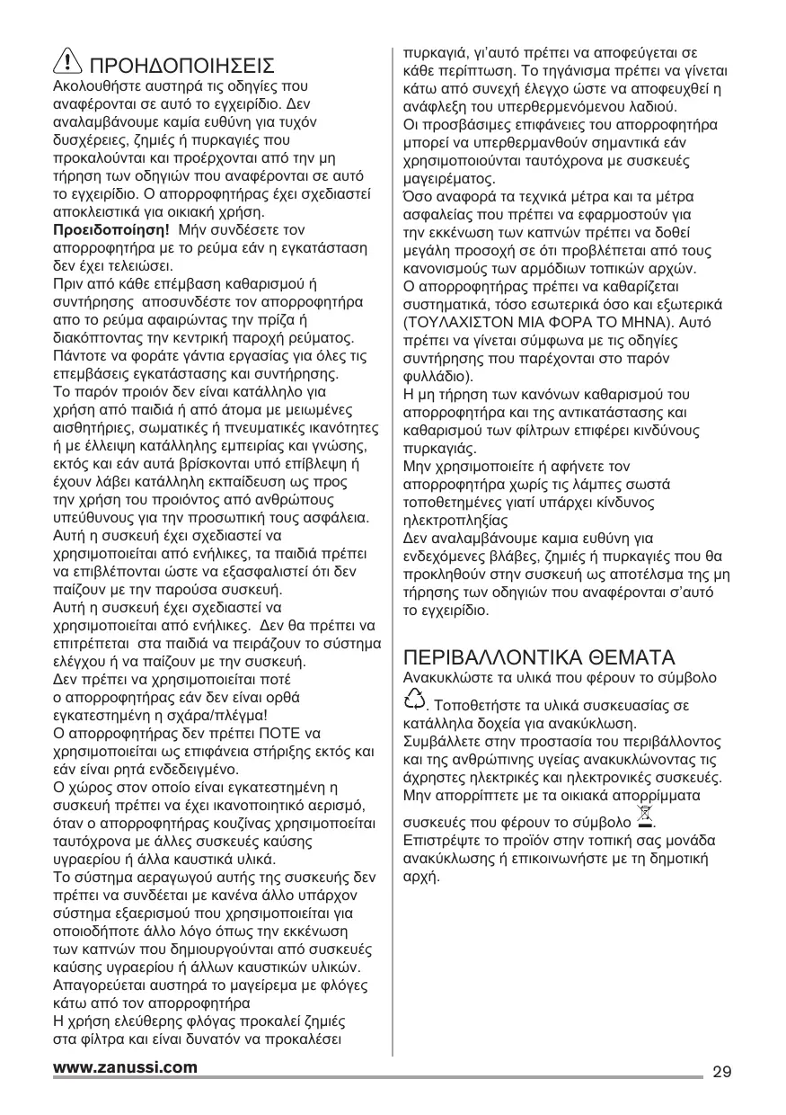 πυρκαγιά, γι’αυτό πρέπει να αποφεύγεται σε κάθε περίπτωση. Το τηγάνισμα πρέπει να γίνεται κάτω από συνεχή έλεγχο ώστε να αποφευχθεί η ανάφλεξη του υπερθερμενόμενου λαδιού. Οι προσβάσιμες επιφάνειες του απορροφητήρα μπορεί να υπερθερμανθούν σημαντικά εάν χρησιμοποιούνται ταυτόχρονα με συσκευές μαγειρέματος. Όσο αναφορά τα τεχνικά μέτρα και τα μέτρα ασφαλείας που πρέπει να εφαρμοστούν για την εκκένωση των καπνών πρέπει να δοθεί μεγάλη προσοχή σε ότι προβλέπεται από τους κανονισμούς των αρμόδιων τοπικών αρχών. Ο απορροφητήρας πρέπει να καθαρίζεται συστηματικά, τόσο εσωτερικά όσο και εξωτερικά (ΤΟΥΛΑΧΙΣΤΟΝ ΜΙΑ ΦΟΡΑ ΤΟ ΜΗΝΑ). Αυτό πρέπει να γίνεται σύμφωνα με τις οδηγίες συντήρησης που παρέχονται στο παρόν φυλλάδιο). Η μη τήρηση των κανόνων καθαρισμού του απορροφητήρα και της αντικατάστασης και καθαρισμού των φίλτρων επιφέρει κινδύνους πυρκαγιάς. Μην χρησιμοποιείτε ή αφήνετε τον απορροφητήρα χωρίς τις λάμπες σωστά τοποθετημένες γιατί υπάρχει κίνδυνος ηλεκτροπληξίας Δεν αναλαμβάνουμε καμια ευθύνη για ενδεχόμενες βλάβες, ζημιές ή πυρκαγιές που θα προκληθούν στην συσκευή ως αποτέλσμα της μη τήρησης των οδηγιών που αναφέρονται σ’αυτό το εγχειρίδιο.