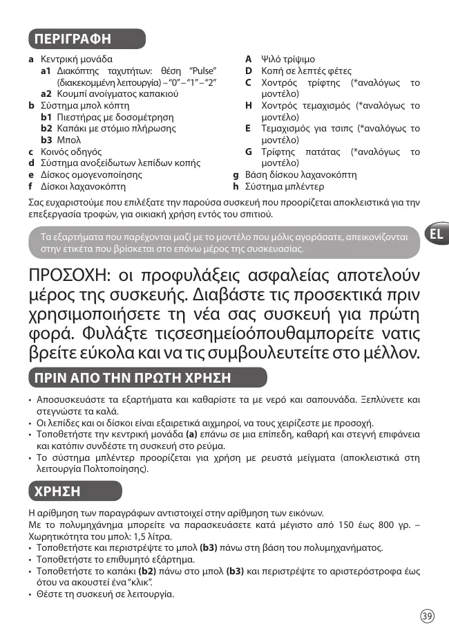 AVERTISSEMENT : Les consignes de sécurité font partie de l’appareil. Veuillez les lire attentivement avant d’utiliser votre nouvel appareil. Gardez-les dans un endroit où vous pourrez les retrouver et vous y référer ultérieurement. AVANT LA PREMIÈRE UTILISATION • Sortez les accessoires de leur emballage et nettoyez-les à l’eau savonneuse. Rincez puis séchez soigneusement. • Les couteaux et disques sont extrêmement aiguisés, manipulez-les avec précaution. • Placez le bloc moteur (a) sur une surface plane, propre et sèche puis branchez votre appareil. • Le blender system est à utiliser avec des préparations liquides (uniquement pour la fonction Mixer).