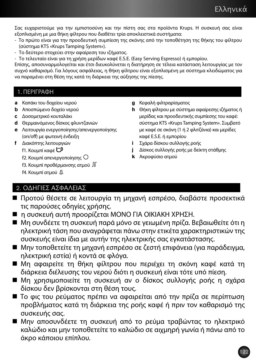 - L’un pour le tassage progressif de la mouture lors du positionnement du porte-filtre (système KTS « Krups Tamping System »). - L’autre pour l’éjection du marc. - Le dernier pour l’utilisation de dosettes E.S.E. (Easy Serving Espresso) ou souples. Il est en outre démontable, ce qui permet de le maintenir, par des nettoyages fréquents, en parfait état de fonctionnement. Par sécurité, votre porte-filtre est équipé d’un système de verrouillage pour qu’il reste en place lors de la montée en pression.