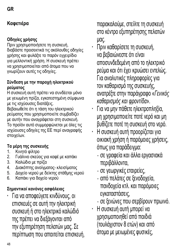 Cet appareil doit être branché sur une prise de courant avec terre installée selon les normes en vigueur. Assurez-vous que la tension d’alimentation correspond à la tension indiquée sur la plaque signalétique. Ce produit est conforme à toutes les directives relatives au marquage “CE”. Familiarisez-vous avec votre appareil 1. Porte-filtre pivotant & filtre 2. Verseuse en verre avec couvercle 3. Cordon d’alimentation avec fiche 4. Interrupteur 5. Réservoir d’eau avec indicateur du niveau d’eau 6. Couvercle du réservoir d’eau Consignes de sécurité