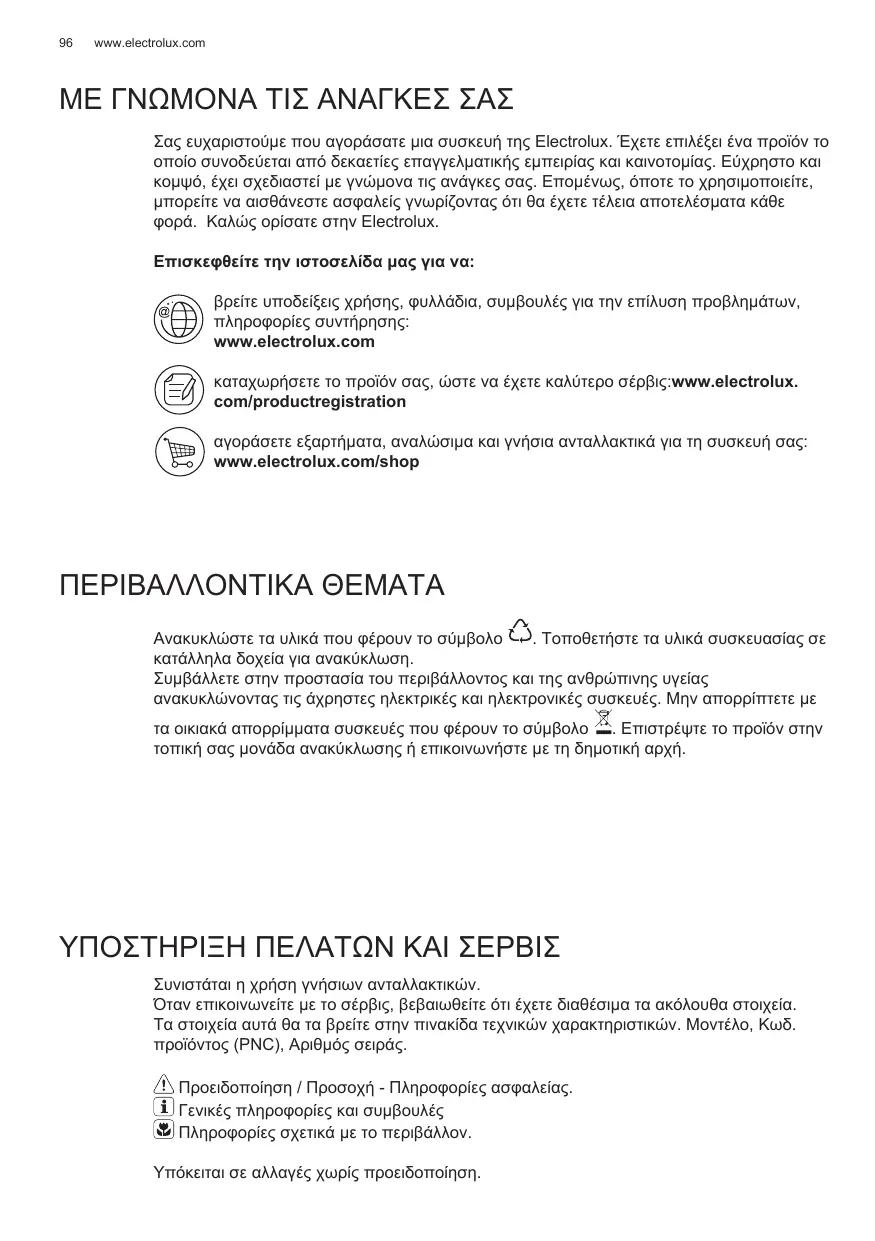 www.electrolux.com ΜΕ ΓΝΩΜΟΝΑ ΤΙΣ ΑΝΑΓΚΕΣ ΣΑΣ Σας ευχαριστούμε που αγοράσατε μια συσκευή της Electrolux. Έχετε επιλέξει ένα προϊόν το οποίο συνοδεύεται από δεκαετίες επαγγελματικής εμπειρίας και καινοτομίας. Εύχρηστο και κομψό, έχει σχεδιαστεί με γνώμονα τις ανάγκες σας. Επομένως, όποτε το χρησιμοποιείτε, μπορείτε να αισθάνεστε ασφαλείς γνωρίζοντας ότι θα έχετε τέλεια αποτελέσματα κάθε φορά. Καλώς ορίσατε στην Electrolux. Επισκεφθείτε την ιστοσελίδα μας για να: βρείτε υποδείξεις χρήσης, φυλλάδια, συμβουλές για την επίλυση προβλημάτων, πληροφορίες συντήρησης: www.electrolux.com καταχωρήσετε το προϊόν σας, ώστε να έχετε καλύτερο σέρβις:www.electrolux. com/productregistration αγοράσετε εξαρτήματα, αναλώσιμα και γνήσια ανταλλακτικά για τη συσκευή σας: www.electrolux.com/shop ΠΕΡΙΒΑΛΛΟΝΤΙΚΑ ΘΕΜΑΤΑ Ανακυκλώστε τα υλικά που φέρουν το σύμβολο . Τοποθετήστε τα υλικά συσκευασίας σε κατάλληλα δοχεία για ανακύκλωση. Συμβάλλετε στην προστασία του περιβάλλοντος και της ανθρώπινης υγείας ανακυκλώνοντας τις άχρηστες ηλεκτρικές και ηλεκτρονικές συσκευές. Μην απορρίπτετε με τα οικιακά απορρίμματα συσκευές που φέρουν το σύμβολο . Επιστρέψτε το προϊόν στην τοπική σας μονάδα ανακύκλωσης ή επικοινωνήστε με τη δημοτική αρχή. ΥΠΟΣΤΗΡΙΞΗ ΠΕΛΑΤΩΝ ΚΑΙ ΣΕΡΒΙΣ Συνιστάται η χρήση γνήσιων ανταλλακτικών. Όταν επικοινωνείτε με το σέρβις, βεβαιωθείτε ότι έχετε διαθέσιμα τα ακόλουθα στοιχεία. Τα στοιχεία αυτά θα τα βρείτε στην πινακίδα τεχνικών χαρακτηριστικών. Μοντέλο, Κωδ. προϊόντος (PNC), Αριθμός σειράς. Προειδοποίηση / Προσοχή - Πληροφορίες ασφαλείας. Γενικές πληροφορίες και συμβουλές Πληροφορίες σχετικά με το περιβάλλον. Υπόκειται σε αλλαγές χωρίς προειδοποίηση.