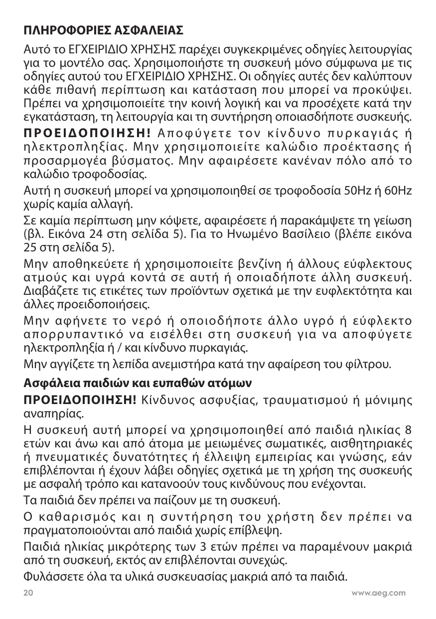 ΠΛΗΡΟΦΟΡΙΕΣ ΑΣΦΑΛΕΙΑΣ Αυτό το ΕΓΧΕΙΡΙΔΙΟ ΧΡΗΣΗΣ παρέχει συγκεκριμένες οδηγίες λειτουργίας για το μοντέλο σας. Χρησιμοποιήστε τη συσκευή μόνο σύμφωνα με τις οδηγίες αυτού του ΕΓΧΕΙΡΙΔΙΟ ΧΡΗΣΗΣ. Οι οδηγίες αυτές δεν καλύπτουν κάθε πιθανή περίπτωση και κατάσταση που μπορεί να προκύψει. Πρέπει να χρησιμοποιείτε την κοινή λογική και να προσέχετε κατά την εγκατάσταση, τη λειτουργία και τη συντήρηση οποιασδήποτε συσκευής. ΠΡΟΕΙΔΟΠΟΙΗΣΗ! Αποφύγετε τον κίνδυνο πυρκαγιάς ή ηλεκτροπληξίας. Μην χρησιμοποιείτε καλώδιο προέκτασης ή προσαρμογέα βύσματος. Μην αφαιρέσετε κανέναν πόλο από το καλώδιο τροφοδοσίας. Αυτή η συσκευή μπορεί να χρησιμοποιηθεί σε τροφοδοσία 50Hz ή 60Hz χωρίς καμία αλλαγή. Σε καμία περίπτωση μην κόψετε, αφαιρέσετε ή παρακάμψετε τη γείωση (βλ. Εικόνα 24 στη σελίδα 5). Για το Ηνωμένο Βασίλειο (βλέπε εικόνα 25 στη σελίδα 5). Μην αποθηκεύετε ή χρησιμοποιείτε βενζίνη ή άλλους εύφλεκτους ατμούς και υγρά κοντά σε αυτή ή οποιαδήποτε άλλη συσκευή. Διαβάζετε τις ετικέτες των προϊόντων σχετικά με την ευφλεκτότητα και άλλες προειδοποιήσεις. Μην αφήνετε το νερό ή οποιοδήποτε άλλο υγρό ή εύφλεκτο α πορρυπαν τικό να εισέλθει σ τη συσκευή για να α ποφύγετε ηλεκτροπληξία ή / και κίνδυνο πυρκαγιάς. Μην αγγίζετε τη λεπίδα ανεμιστήρα κατά την αφαίρεση του φίλτρου. Ασφάλεια παιδιών και ευπαθών ατόμων ΠΡΟΕΙΔΟΠΟΙΗΣΗ! Κίνδυνος ασφυξίας, τραυματισμού ή μόνιμης Η συσκευή αυτή μπορεί να χρησιμοποιηθεί από παιδιά ηλικίας 8 ετών και άνω και από άτομα με μειωμένες σωματικές, αισθητηριακές ή πνευματικές δυνατότητες ή έλλειψη εμπειρίας και γνώσης, εάν επιβλέπονται ή έχουν λάβει οδηγίες σχετικά με τη χρήση της συσκευής με ασφαλή τρόπο και κατανοούν τους κινδύνους που ενέχονται. Τα παιδιά δεν πρέπει να παίζουν με τη συσκευή. Ο κα θ αρ ι σ μ ό ς κα ι η σ υ ν τ ήρ η σ η το υ χρ ή σ τ η δ ε ν πρ έ πει ν α πραγματοποιούνται από παιδιά χωρίς επίβλεψη. Παιδιά ηλικίας μικρότερης των 3 ετών πρέπει να παραμένουν μακριά από τη συσκευή, εκτός αν επιβλέπονται συνεχώς. Φυλάσσετε όλα τα υλικά συσκευασίας μακριά από τα παιδιά.