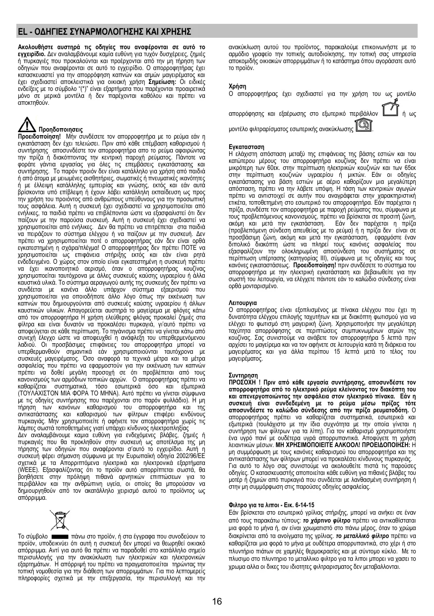 La hotte est équipée d’un panneau de contrôle doté d’une commande de vitesse d’aspiration et d’une commande d’éclairage du plan de cuisson. Utiliser la puissance d’aspiration maximum en cas de concentration très importante des vapeurs de cuisson. Nous conseillons d’allumer la hotte 5 minutes avant de commencer la cuisson et de la faire fonctionner encore pendant 15 minutes environ après avoir terminé la cuisson. Entretien Attention! Avant toute opération de nettoyage ou d’entretien, débrancher la hotte du circuit électrique en enlevant la prise ou en coupant l’interrupteur général de l’habitation. La hotte doit être régulièrement nettoyée à l’intérieur et à l’extérieur (au moins à la même fréquence que pour l’entretien des filtres à graisse). Pour le nettoyage, utiliser un chiffon humidifié avec un détergent liquide neutre. Ne pas utiliser de produit contenant des abrasifs. NE PAS UTILISER D'ALCOOL! ATTENTION: Il y a risque d’incendie si vous ne respectez pas les instructions concernant le nettoyage de l’appareil et le remplacement ou le nettoyage du filtre. La responsabilité du constructeur ne peut en aucun cas être engagée dans le cas d’un endommagement du moteur ou d’incendie liés à un entretien négligé ou au non respect des consignes de sécurité précédemment mentionnées. Filtre anti-gras - Fig. 6-14-15 S’il est situé à l’intérieur d’une grille support, il peut s’agir d’un des modèles suivants: Le filtre en papier doit etre chengé une fois par mois ou s’il se colore sur sa partie supérieure, lorsque la coloration transparait au travers de la grille. Il filtro metallique doit etre nettoyé une fois par mois avec un detergent non agressif, à la main ou dans le lave vaisselle à basse température et pendant un cycle court. Le lavage du filtre anti-graisse métallique au lave-vaisselle peut en provoquer la décoloration. Toutefois, les caractéristiques de filtrage ne seront en aucun cas modifiées.