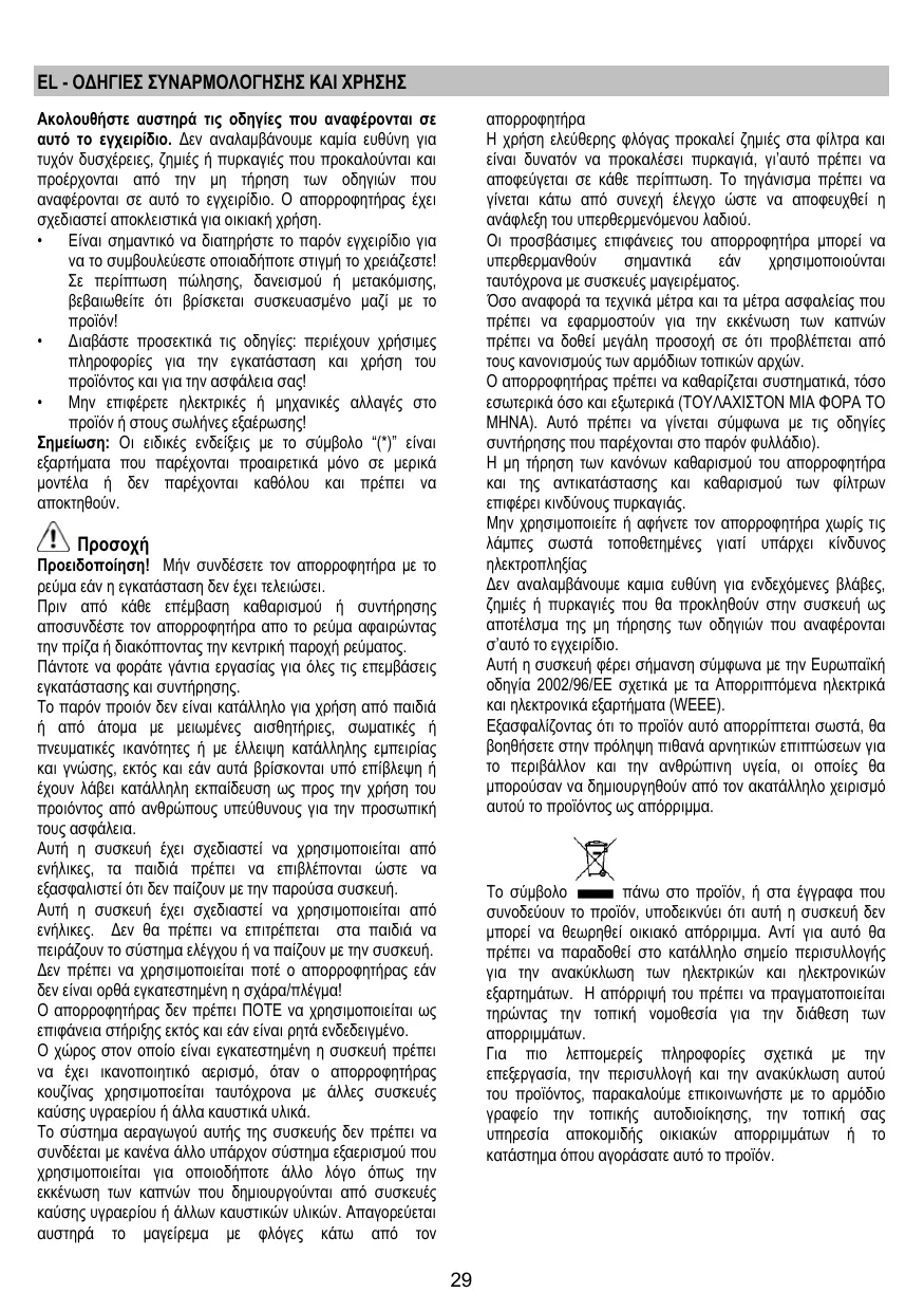 La non observation de ces normes de nettoyage de la hotte et du changement et nettoyage des filtres comporte des risques d’incendie. Ne pas utiliser ou laisser la hotte sans que les ampoules soient correctement placées pour éviter tout risque de choc électrique. La société décline toute responsabilité pour d’éventuels inconvénients, dégâts ou incendies provoqués par l’appareil et dérivés de la non observation des instructions reprises dans ce manuel. Cet appareil porte le symbole du recyclage conformément à la Directive Européenne 2002/96/CE concernant les Déchets d’Équipements Électriques et Électroniques (DEEE ou WEEE). En procédant correctement à la mise au rebut de cet appareil, vous contribuerez à empêcher toute conséquence nuisible pour l’environnement et la santé de l’homme.