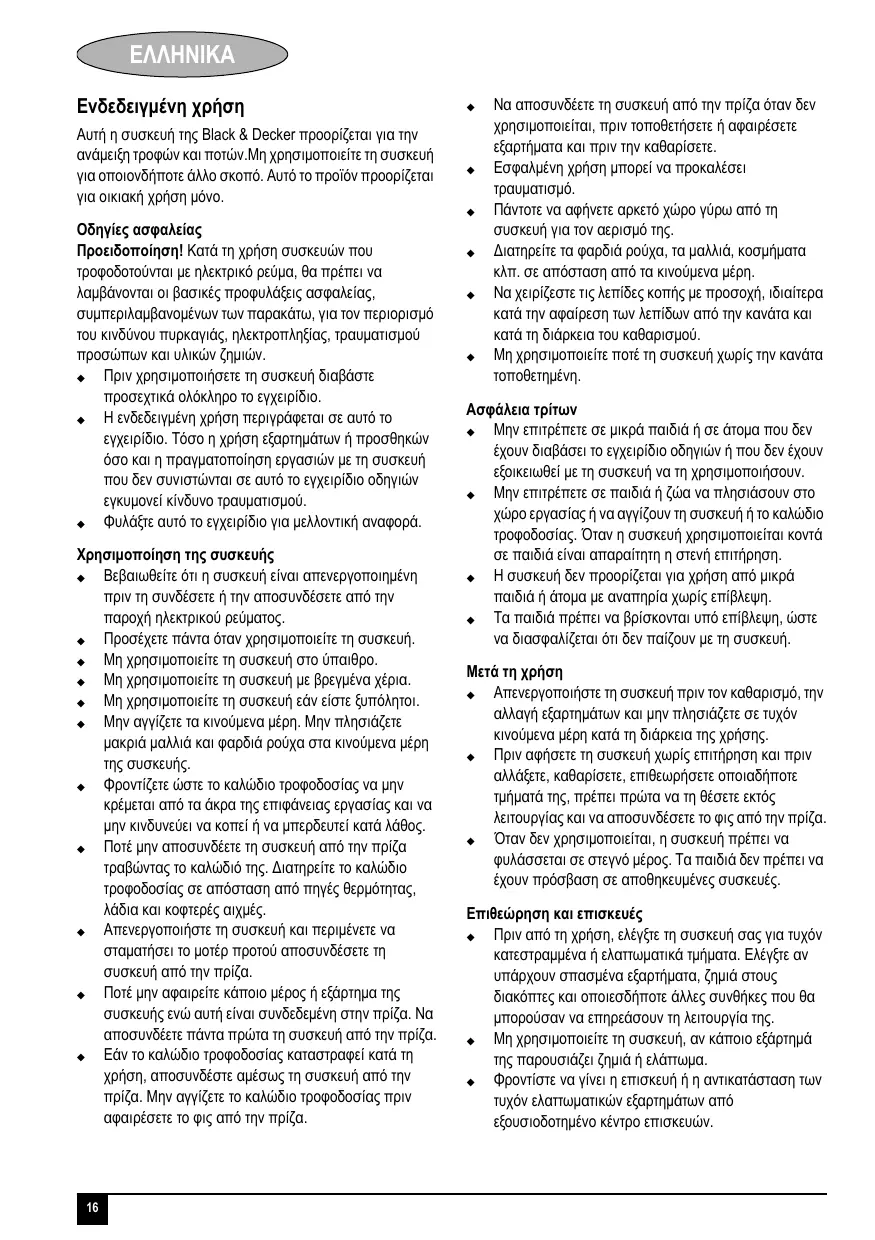 Αυτή η συσκευή της Black & Decker προορίζεται για την ανάμειξη τροφών και ποτών.Μη χρησιμοποιείτε τη συσκευή για οποιονδήποτε άλλο σκοπό. Αυτό το προϊόν προορίζεται για οικιακή χρήση μόνο.
