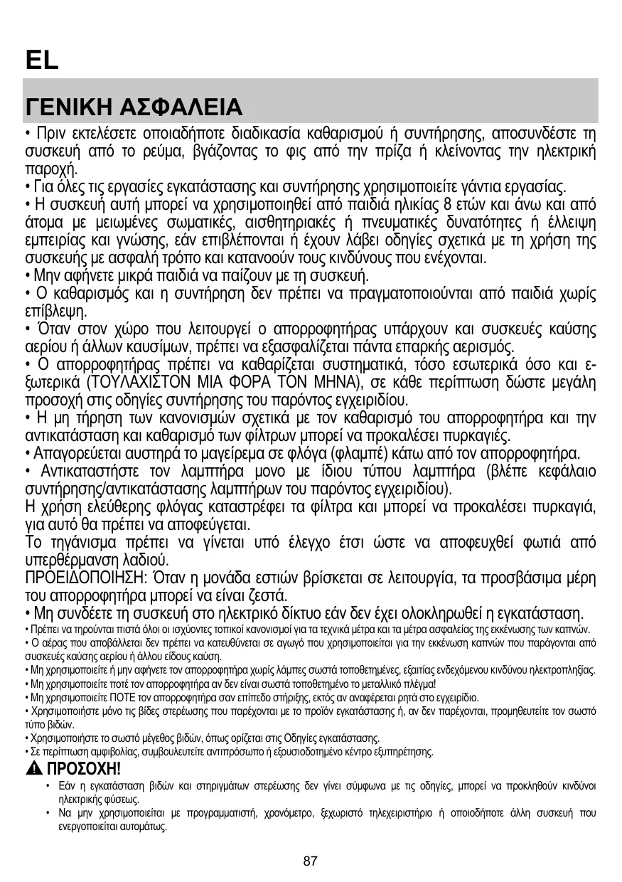 • Les enfants ne doivent pas jouer avec l’appareil. • Le nettoyage et l’entretien par l’usager ne doivent pas être effectués par des enfants sans surveillance. • La pièce doit avoir une aération suffisante lorsque la hotte est utilisée conjointement avec d'autres appareils fonctionnant au gaz ou autres combustibles. • La hotte doit être régulièrement nettoyée à la fois à l'intérieur et à l'extérieur (AU MOINS UNE FOIS PAR MOIS); cela devrait se faire en conformité avec les instructions d'entretien. Le non respect des instructions expressément fournies concernant le nettoyage de la hotte et des filtres peut provoquer des risques d'incendie. • Ne pas flamber d’aliments sous la hotte. • Pour le remplacement de la lampe, utilisez uniquement le type de lampe spécifié dans la section remplacement/maintenance lampe dans ce manuel. L'utilisation d'une flamme nue est dommageable pour les filtres et peut causer un incendie, par conséquent, il est déconseillé de l'utiliser. La friture doit être faite avec soin afin de s’assurer que l’huile surchauffée ne prenne pas feu. AVERTISSEMENT: Lorsque la table de cuisson est en fonctionnement, les parties accessibles de la hotte peuvent devenir très chaudes. • Ne pas brancher l'appareil au réseau électrique avant que l'installation ne soit complètement terminée.