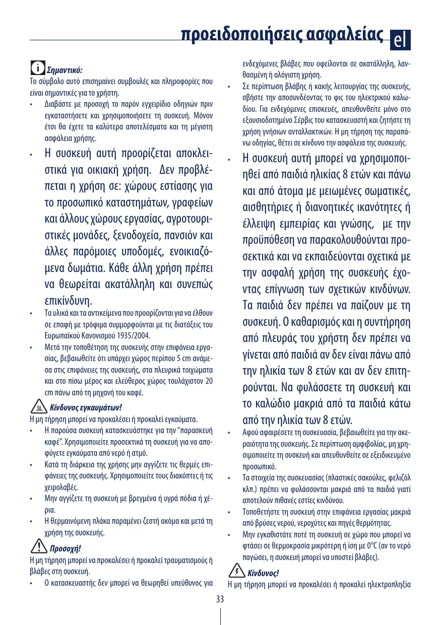 Si vous avez des doutes, ne l’utilisez pas et adressez-vous à un spécialiste. • Ne laissez pas les éléments composant l’emballage (sachets en plastique, polystyrène expansé etc.) à la portée des enfants car ce sont des sources de danger potentielles! • Placez l’appareil sur un plan de travail loin des robinets d’eau, des éviers et des sources de chaleur. • N’installez jamais l’appareil dans un endroit où la température peut descendre à ou au-dessous de 0° C (si l’eau gèle, l’appareil peut se détériorer). Danger ! Le non-respect de ces consignes peut entraîner des risques de blessures graves et d’électrocution.