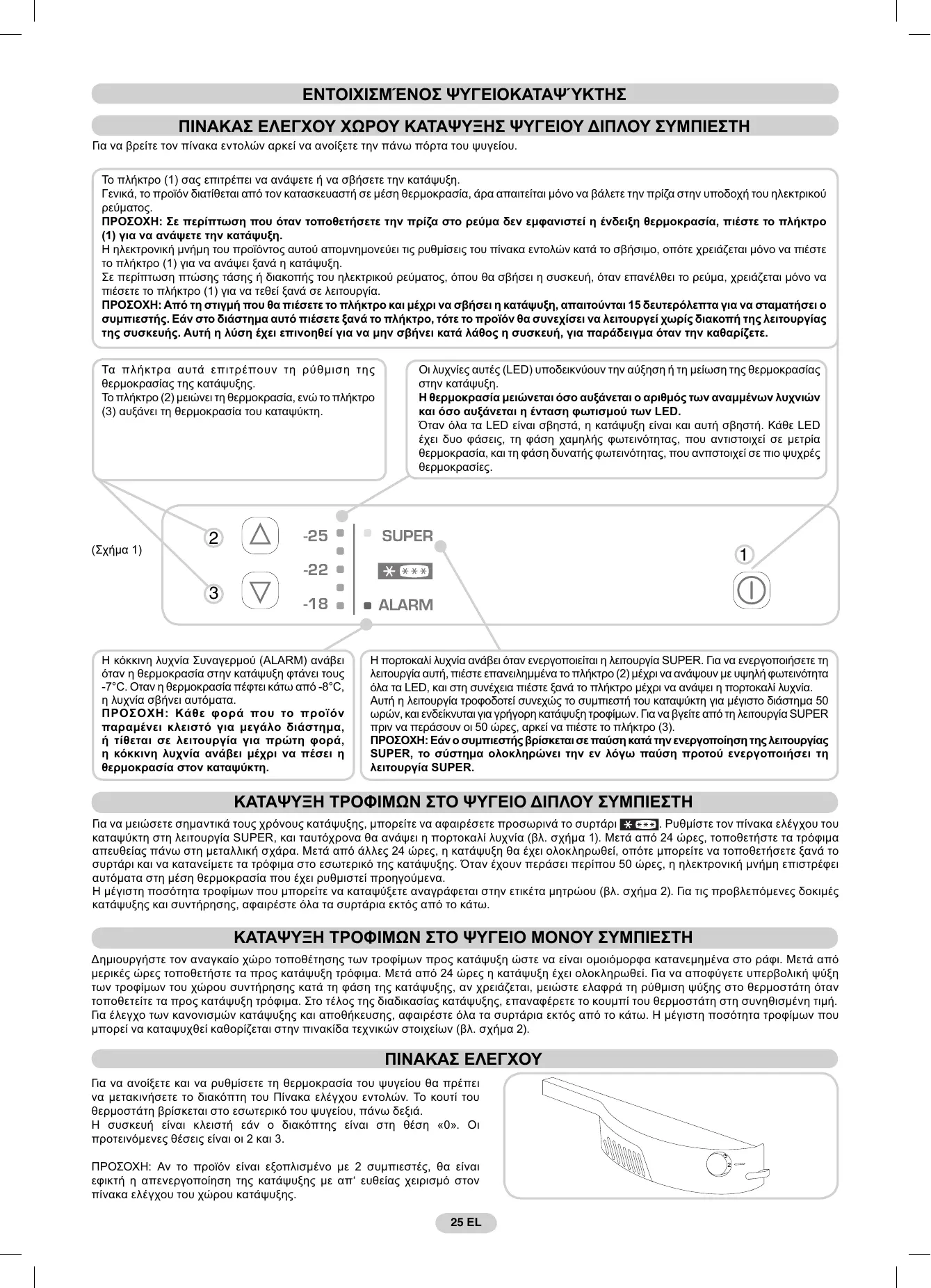 1 Le témoin orange s‘allume en cas d‘activation de la fonction SUPER. Pour activer cette fonction, appuyez plusieurs fois sur la touche (2) de sorte que tous les LED aient une forte intensité lumineuse, puis appuyez à nouveau sur la touche jusqu‘à ce que le témoin orange s‘allume. Cette fonction alimente le compresseur du freezer en continu pendant une durée maximale de 50 heures. Elle est indiquée pour congeler rapidement les aliments. Pour désactiver la fonction SUPER avant que les 50 heures ne soient écoulées, il suffit d’appuyer sur la touche (3). ATTENTION: si le compresseur est en pause à l‘activation de la fonction SUPER, le système attendra que le compresseur redémarre avant d’activer ce mode.