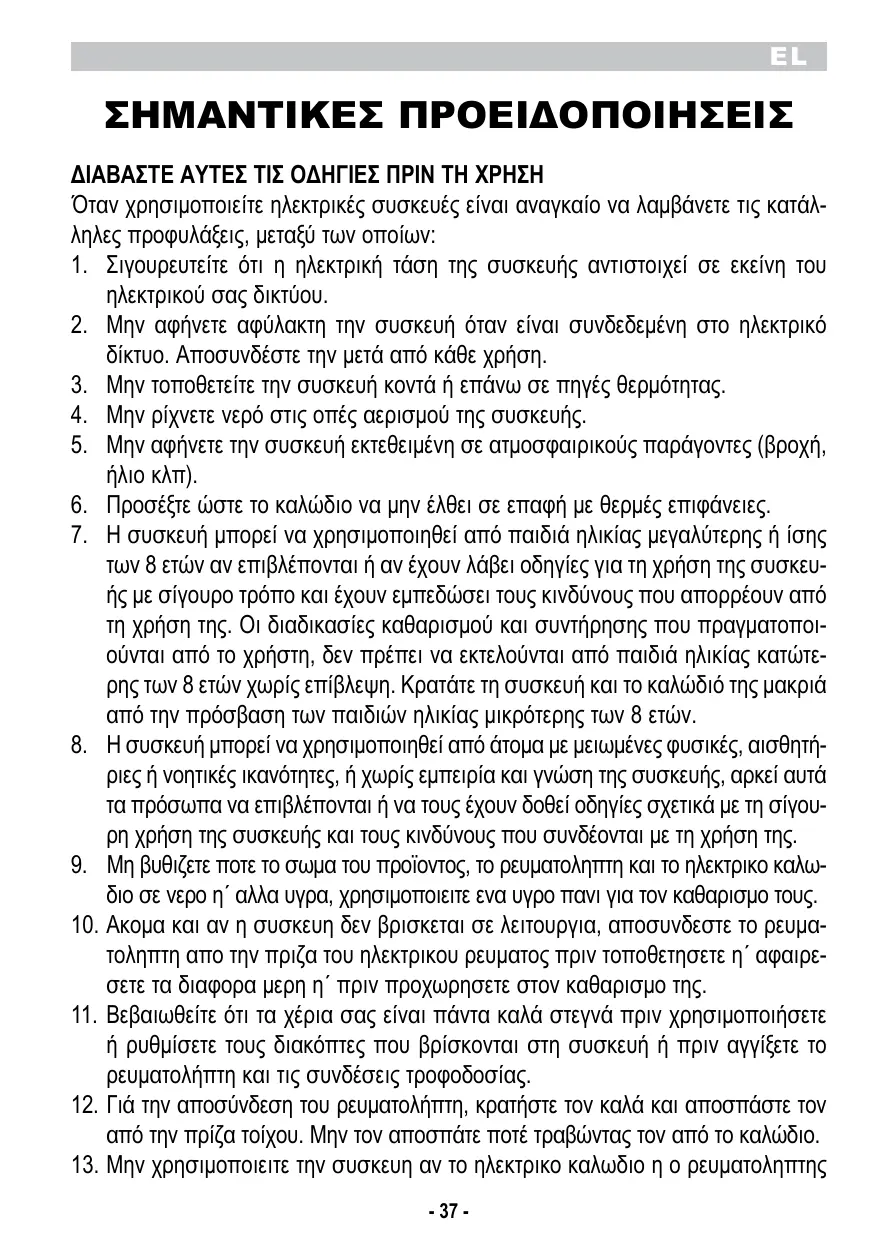 électrique; débranchez-le après chaque utilisation. 3. Ne placez pas l’appareil au dessus ou près de sources de chaleur. 4. Lors de son utilisation, placez l’appareil sur une surface horizontale et stable. 5. N’exposez jamais l’appareil aux agents atmosphériques externes (pluie, soleil, etc.). 6. Veillez à ce que le câble électrique n’entre jamais en contact avec des surfaces chaudes. 7. L’appareil peut être utilisé par des enfants de 8 ans ou plus à condition d’être suivis par une personne responsable et d’avoir reçu les instructions nécessaires et compris les dangers représentés par l’utilisation de l’appareil. Les opérations de nettoyage et d’entretien effectuées par l’utilisateur ne doivent pas être faites par des enfants âgés de moins de 8 ans sans surveillance. Gardez l’appareil et son cordon électrique hors de la portée des enfants âgés de moins de 8 ans. 8. L’appareil peut être utilisé par les personnes à capacités physiques, sensorielles ou mentales réduites, ou dépourvues de l’expérience et de la connaissance nécessaires, à condition qu’ils soient surveillés ou qu’ils aient reçu une formation adéquate sur l’usage de l’appareil et sur la compréhension des dangers qui y sont liés. 9. Ne pas plonger le corps du produit, la fiche ni le cable electrique dans l’eau ou autres liquides, et utiliser toujours un chiffon humide pour les nettoyer. 10. Meme lorsque l’appareil n’est pas en marche, debrancher la fiche de la prise de courant electrique avant d’installer ou de defaire les simples parties ou avant de proceder au nettoyage. 11. Vérifier d’avoir toujours les mains sèches avant d’utiliser ou de régler les interrupteurs placés sur l’appareil ou avant de manipuler la fiche et les connexions électriques. 12. Pour débrancher l’appareil, saisir directement la fiche en la débranchant de la prise murale. Ne tirez jamais sur le câble d’alimentation. - 12 -