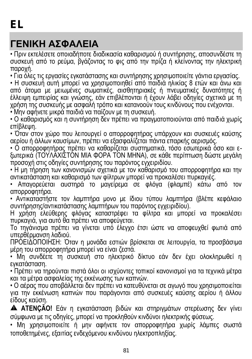 EL ΓΕΝΙΚΗ ΑΣΦΑΛΕΙΑ • Πριν εκτελέσετε οποιαδήποτε διαδικασία καθαρισμού ή συντήρησης, αποσυνδέστε τη συσκευή από το ρεύμα, βγάζοντας το φις από την πρίζα ή κλείνοντας την ηλεκτρική παροχή. • Για όλες τις εργασίες εγκατάστασης και συντήρησης χρησιμοποιείτε γάντια εργασίας. • Η συσκευή αυτή μπορεί να χρησιμοποιηθεί από παιδιά ηλικίας 8 ετών και άνω και από άτομα με μειωμένες σωματικές, αισθητηριακές ή πνευματικές δυνατότητες ή έλλειψη εμπειρίας και γνώσης, εάν επιβλέπονται ή έχουν λάβει οδηγίες σχετικά με τη χρήση της συσκευής με ασφαλή τρόπο και κατανοούν τους κινδύνους που ενέχονται. • Μην αφήνετε μικρά παιδιά να παίζουν με τη συσκευή. • Ο καθαρισμός και η συντήρηση δεν πρέπει να πραγματοποιούνται από παιδιά χωρίς επίβλεψη. • Όταν στον χώρο που λειτουργεί ο απορροφητήρας υπάρχουν και συσκευές καύσης αερίου ή άλλων καυσίμων, πρέπει να εξασφαλίζεται πάντα επαρκής αερισμός. • Ο απορροφητήρας πρέπει να καθαρίζεται συστηματικά, τόσο εσωτερικά όσο και εξωτερικά (ΤΟΥΛΑΧΙΣΤΟΝ ΜΙΑ ΦΟΡΑ ΤΟΝ ΜΗΝΑ), σε κάθε περίπτωση δώστε μεγάλη προσοχή στις οδηγίες συντήρησης του παρόντος εγχειριδίου. • Η μη τήρηση των κανονισμών σχετικά με τον καθαρισμό του απορροφητήρα και την αντικατάσταση και καθαρισμό των φίλτρων μπορεί να προκαλέσει πυρκαγιές. • Απαγορεύεται αυστηρά το μαγείρεμα σε φλόγα (φλαμπέ) κάτω από τον απορροφητήρα. • Αντικαταστήστε τον λαμπτήρα μονο με ίδιου τύπου λαμπτήρα (βλέπε κεφάλαιο συντήρησης/αντικατάστασης λαμπτήρων του παρόντος εγχειριδίου). Η χρήση ελεύθερης φλόγας καταστρέφει τα φίλτρα και μπορεί να προκαλέσει πυρκαγιά, για αυτό θα πρέπει να αποφεύγεται. Το τηγάνισμα πρέπει να γίνεται υπό έλεγχο έτσι ώστε να αποφευχθεί φωτιά από υπερθέρμανση λαδιού. ΠΡΟΕΙΔΟΠΟΙΗΣΗ: Όταν η μονάδα εστιών βρίσκεται σε λειτουργία, τα προσβάσιμα μέρη του απορροφητήρα μπορεί να είναι ζεστά. • Μη συνδέετε τη συσκευή στο ηλεκτρικό δίκτυο εάν δεν έχει ολοκληρωθεί η εγκατάσταση. • Πρέπει να τηρούνται πιστά όλοι οι ισχύοντες τοπικοί κανονισμοί για τα τεχνικά μέτρα και τα μέτρα ασφαλείας της εκκένωσης των καπνών. • Ο αέρας που αποβάλλεται δεν πρέπει να κατευθύνεται σε αγωγό που χρησιμοποιείται για την εκκένωση καπνών που παράγονται από συσκευές καύσης αερίου ή άλλου είδους καύση. ATENÇÃO! Εάν η εγκατάσταση βιδών και στηριγμάτων στερέωσης δεν γίνει σύμφωνα με τις οδηγίες, μπορεί να προκληθούν κινδύνοι ηλεκτρικής φύσεως. • Μη χρησιμοποιείτε ή μην αφήνετε τον απορροφητήρα χωρίς λάμπες σωστά τοποθετημένες, εξαιτίας ενδεχόμενου κινδύνου ηλεκτροπληξίας. 81