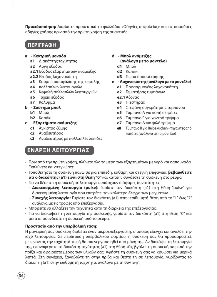 ΠΕΡΙΓΡΑΦΗ a - Κεντρική μονάδα a1 Διακόπτης ταχύτητας a2 Αργή έξοδος a2.1 Έξοδος εξαρτημάτων ανάμειξης a2.2 Έξοδος λαχανοκόπτη a3 Κουμπί απασφάλισης της κεφαλής a4 πολλαπλών λειτουργιών a5 Κεφαλή πολλαπλών λειτουργιών a6 Ταχεία έξοδος a7 Κάλυμμα b - Σύστημα μπολ b1 Μπολ b2 Καπάκι c - Εξαρτήματα ανάμειξης c1 Άγκιστρο ζύμης c2 Αναδευτήρας c3 Αναδευτήρας με πολλαπλές λεπίδες