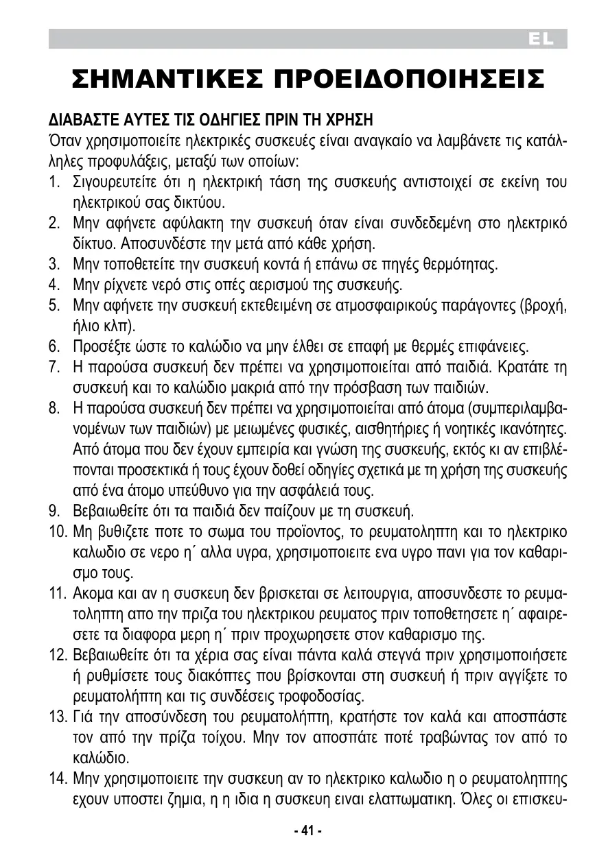 électrique; débranchez-le après chaque utilisation. 3. Ne placez pas l’appareil au dessus ou près de sources de chaleur. 4. Lors de son utilisation, placez l’appareil sur une surface horizontale et stable. 5. N’exposez jamais l’appareil aux agents atmosphériques externes (pluie, soleil, etc.). 6. Veillez à ce que le câble électrique n’entre jamais en contact avec des surfaces chaudes. 7. Cet appareil ne doit pas être utilisé par les enfants. Garder l’appareil et le cordon électrique loin de la portée des enfants. 8. Cet appareil ne doit pas être utilisé par des personnes (y compris les enfants) dont les capacités physiques, sensorielles ou mentales sont réduites, ou par des personnes manquant d’expérience et de connaissance d’appareil, à moins qu’elles ne soient attentivement surveillées et correctement instruites sur l’usage de l’appareil de la part d’une personne responsable de leur sécurité. 9. Vérifiez que les enfant ne jouent pas avec l’appareil. 10. Ne pas plonger le corps du produit, la fiche ni le cable electrique dans l’eau ou autres liquides, et utiliser toujours un chiffon humide pour les nettoyer. 11. Meme lorsque l’appareil n’est pas en marche, debrancher la fiche de la prise de courant electrique avant d’installer ou de defaire les simples parties ou avant de proceder au nettoyage. 12. Vérifier d’avoir toujours les mains sèches avant d’utiliser ou de régler les interrupteurs placés sur l’appareil ou avant de manipuler la fiche et les connexions électriques. 13. Pour débrancher l’appareil, saisir directement la fiche en la débranchant de la prise murale. Ne tirez jamais sur le câble d’alimentation. 14. Ne pas utiliser l’appareil si le cordon electrique ou la fiche sont endommages ou si l’appareil est defectueux; toutes les reparations, y compris la substitution du cordon d’alimentation, doivent etre effectuees exclusivement par le centre de service apres-vente Ariete ou par des techniciens agrees Ariete, de façon a prevenir tout risque de danger. - 13 -