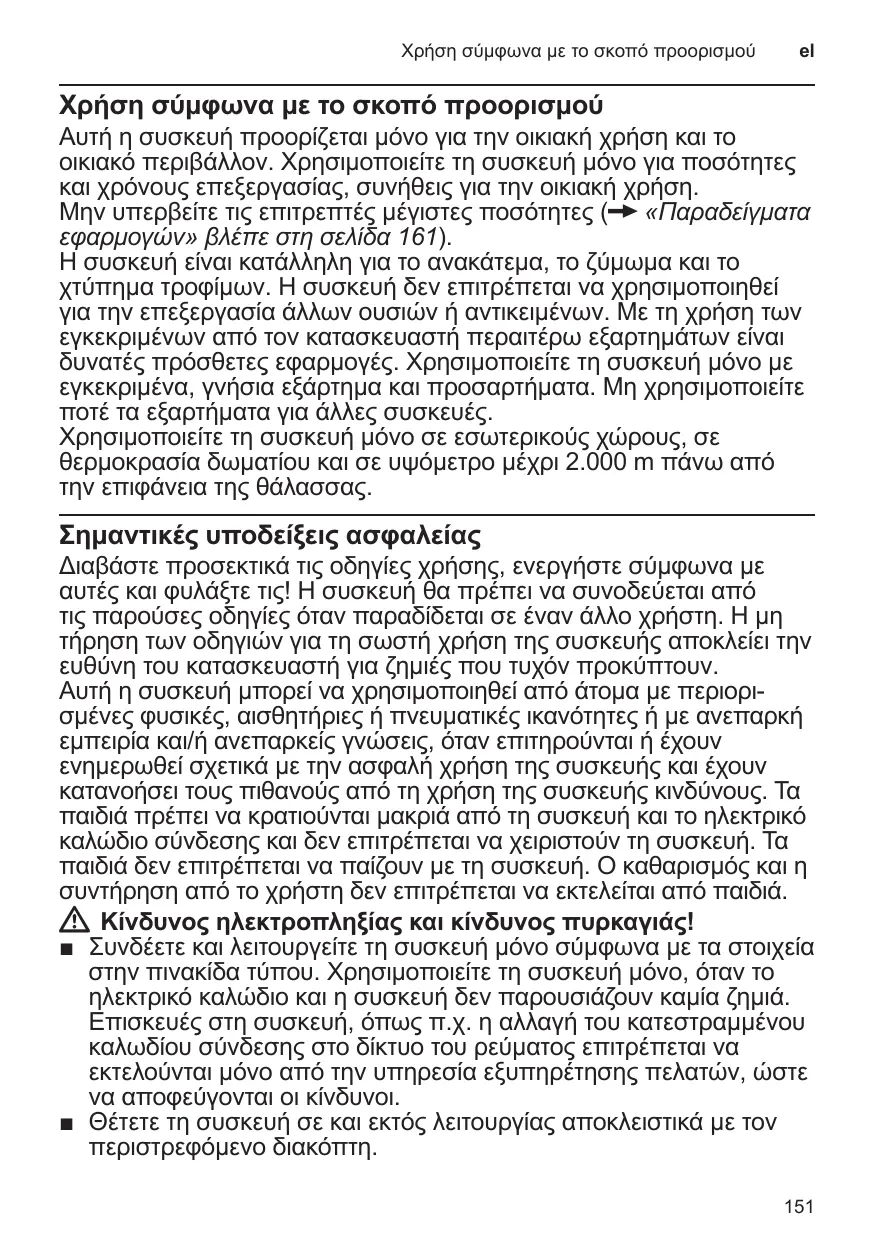 Αυτή η συσκευή προορίζεται μόνο για την οικιακή χρήση και το οικιακό περιβάλλον. Χρησιμοποιείτε τη συσκευή μόνο για ποσότητες και χρόνους επεξεργασίας, συνήθεις για την οικιακή χρήση. Μην υπερβείτε τις επιτρεπτές μέγιστες ποσότητες (X «Παραδείγματα εφαρμογών» βλέπε στη σελίδα 161). Η συσκευή είναι κατάλληλη για το ανακάτεμα, το ζύμωμα και το χτύπημα τροφίμων. Η συσκευή δεν επιτρέπεται να χρησιμοποιηθεί για την επεξεργασία άλλων ουσιών ή αντικειμένων. Με τη χρήση των εγκεκριμένων από τον κατασκευαστή περαιτέρω εξαρτημάτων είναι δυνατές πρόσθετες εφαρμογές. Χρησιμοποιείτε τη συσκευή μόνο με εγκεκριμένα, γνήσια εξάρτημα και προσαρτήματα. Μη χρησιμοποιείτε ποτέ τα εξαρτήματα για άλλες συσκευές. Χρησιμοποιείτε τη συσκευή μόνο σε εσωτερικούς χώρους, σε θερμοκρασία δωματίου και σε υψόμετρο μέχρι 2.000 m πάνω από την επιφάνεια της θάλασσας.