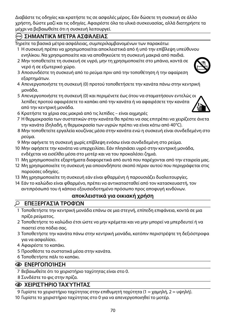 2 N’immergez pas l’appareil dans un liquide, ne l’utilisez pas dans une salle de bains, à proximité d’une source d’eau ou à l’extérieur. 3 Débranchez l’appareil avant d’adapter ou de retirer les accessoires. 4 Eteignez (0) avant de mettre le bol en place sur le bloc moteur. 5 Eteignez (0) et attendez jusqu’à ce que les lames s’arrêtent avant d’enlever le couvercle du bol ou avant d’enlever le bol du bloc moteur. 6 Tenez vos mains à l’écart des lames – elles sont tranchantes 7 Ne remplissez pas avec quelque chose de trop chaud qui n’est plus agréable au toucher pour vous (par ex. températures des liquides inférieures à 40°C). 8 Ne placez aucun ustensile dans le bol lorsque l’appareil est branché. 9 Ne laissez pas l’appareil sans surveillance lorsqu’il est branché. 10 Veillez à ce que le bol ne déborde pas. Tout liquide qui se met sous le bloc moteur pourrait être absorbé par le moteur et risquerait de l’endommager. 11 N’installez que des accessoires et des pièces de rechange qui proviennent du fabricant. 12 N’utilisez pas l’appareil dans un autre but que celui décrit dans ces instructions. 13 N’utilisez pas l’appareil s’il est endommagé ou ne fonctionne pas correctement. 14 Si le câble est abîmé, vous devez le faire remplacer par le fabricant, un de ses techniciens agréés ou une personne également qualifiée, pour éviter tout danger.