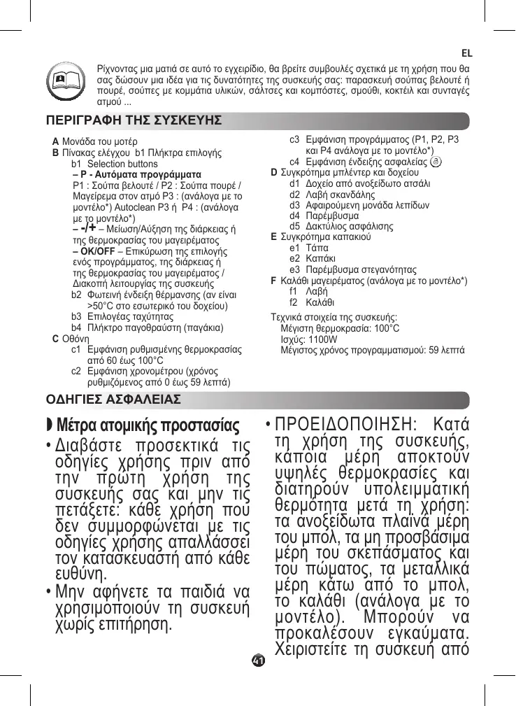c3 Εμφάνιση προγράμματος (P1, P2, P3 και P4 ανάλογα με το μοντέλο*) c4 Εμφάνιση ένδειξης ασφαλείας D Συγκρότημα μπλέντερ και δοχείου d1 Δοχείο από ανοξείδωτο ατσάλι d2 Λαβή σκανδάλης d3 Αφαιρούμενη μονάδα λεπίδων d4 Παρέμβυσμα d5 Δακτύλιος ασφάλισης E Συγκρότημα καπακιού e1 Τάπα e2 Καπάκι e3 Παρέμβυσμα στεγανότητας F Καλάθι μαγειρέματος (ανάλογα με το μοντέλο*) f1 Λαβή f2 Καλάθι Τεχνικά στοιχεία της συσκευής: Μέγιστη θερμοκρασία: 100°C Ισχύς: 1100W Μέγιστος χρόνος προγραμματισμού: 59 λεπτά