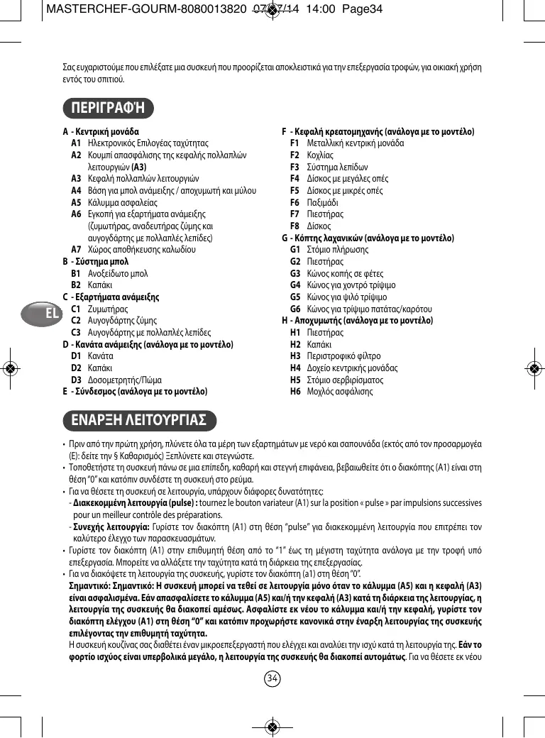 • Pour mettre en marche, vous avez plusieurs possibilités : - Marche intermittente (pulse) : tournez le bouton variateur (A1) sur la position « pulse » par impulsions successives pour un meilleur contrôle des préparations. - Marche continue : tournez le bouton variateur (A1) sur la position désirée de « 1 » à « max » selon les préparations effectuées. Vous pouvez la modifier en cours de préparation. • Pour arrêter l’appareil, ramenez le bouton (A1) sur le « 0 ». Important : L’appareil ne pourra démarrer que si la trappe (A5) et la tête (A3) sont verrouillées. Si vous déverrouillez la trappe (A5) et/ou la tête (A3) en cours de fonctionnement, l’appareil s’arrêtera aussitôt. Reverrouillez la trappe et/ou la tête, revenez en position « 0 » sur le bouton de commande (A1), puis procédez normalement pour la mise en marche de l’appareil en sélectionnant la vitesse souhaitée. Votre appareil de cuisine est équipé d’un micro processeur qui contrôle et analyse la puissance en fonctionnement. En cas de charge trop importante, votre appareil s’arrêtera tout seul. Pour redémarrer 6
