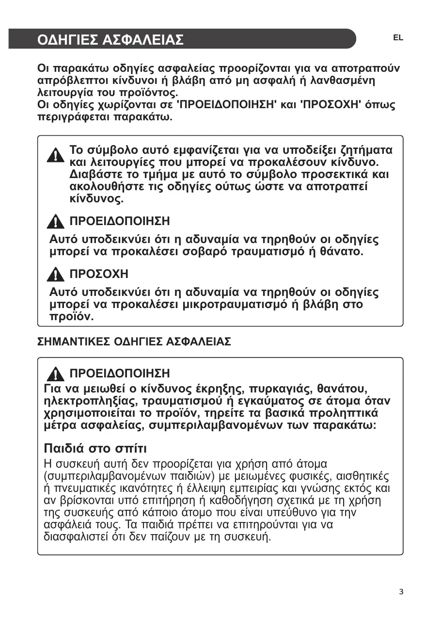Το σύμβολο αυτό εμφανίζεται για να υποδείξει ζητήματα και λειτουργίες που μπορεί να προκαλέσουν κίνδυνο. Διαβάστε το τμήμα με αυτό το σύμβολο προσεκτικά και ακολουθήστε τις οδηγίες ούτως ώστε να αποτραπεί κίνδυνος. ΠΡΟΕΙΔΟΠΟΙΗΣΗ Αυτό υποδεικνύει ότι η αδυναμία να τηρηθούν οι οδηγίες μπορεί να προκαλέσει σοβαρό τραυματισμό ή θάνατο. ΠΡΟΣΟΧΗ Αυτό υποδεικνύει ότι η αδυναμία να τηρηθούν οι οδηγίες μπορεί να προκαλέσει μικροτραυματισμό ή βλάβη στο προϊόν. ΣΗΜΑΝΤΙΚΕΣ ΟΔΗΓΙΕΣ ΑΣΦΑΛΕΙΑΣ