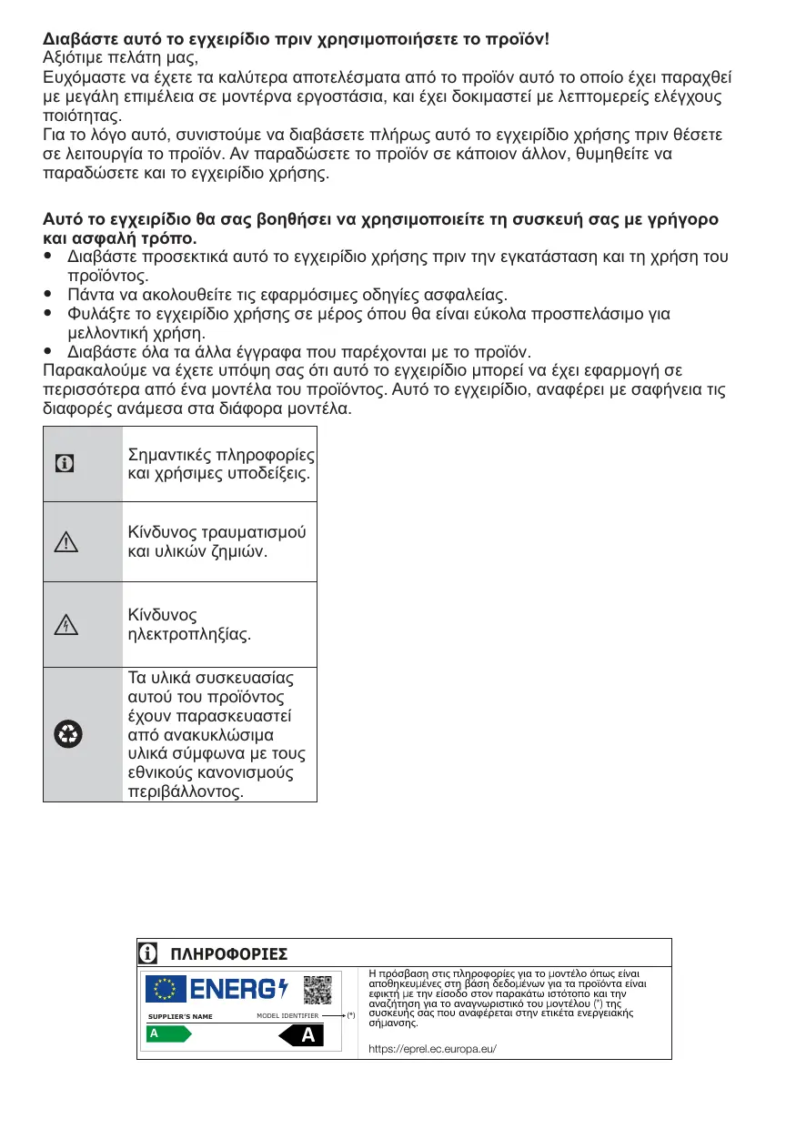 Η πρόσβαση στις πληροφορίες για το μοντέλο όπως είναι αποθηκευμένες στη βάση δεδομένων για τα προϊόντα είναι εφικτή με την είσοδο στον παρακάτω ιστότοπο και την αναζήτηση για το αναγνωριστικό του μοντέλου (*) της συσκευής σας που αναφέρεται στην ετικέτα ενεργειακής σήμανσης. https://eprel.ec.europa.eu/