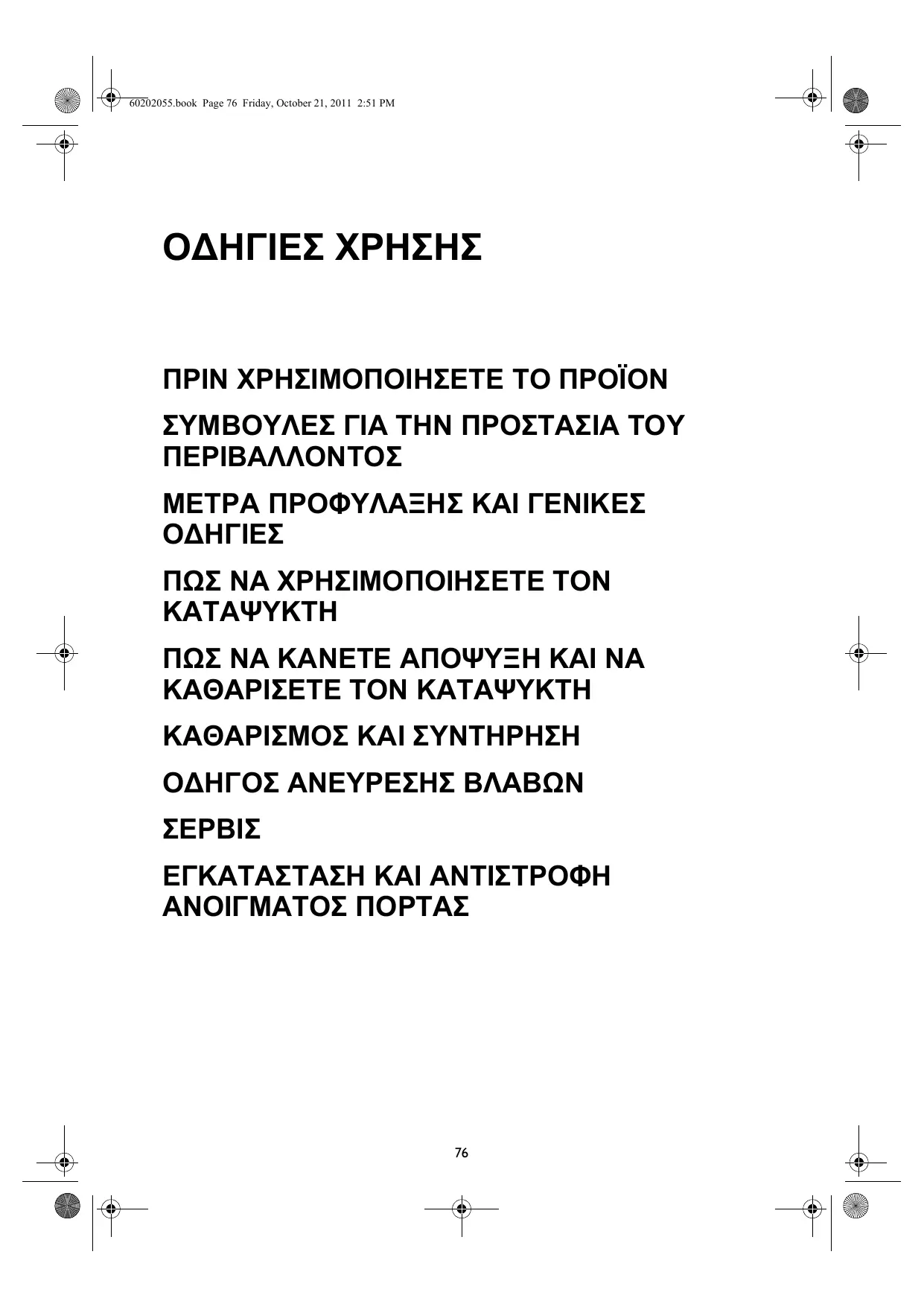 PARETE 60202055.book Page 76 Friday, October 21, 2011 2:51 PM ΟΔΗΓΙΕΣ ΧΡΗΣΗΣ ΠΡΙΝ ΧΡΗΣΙΜΟΠΟΙΗΣΕΤΕ ΤΟ ΠΡΟΪΟΝ ΣΥΜΒΟΥΛΕΣ ΓΙΑ ΤΗΝ ΠΡΟΣΤΑΣΙΑ ΤΟΥ ΠΕΡΙΒΑΛΛΟΝΤΟΣ ΜΕΤΡΑ ΠΡΟΦΥΛΑΞΗΣ ΚΑΙ ΓΕΝΙΚΕΣ ΠΩΣ ΝΑ ΧΡΗΣΙΜΟΠΟΙΗΣΕΤΕ ΤΟΝ ΠΩΣ ΝΑ ΚΑΝΕΤΕ ΑΠΟΨΥΞΗ ΚΑΙ ΝΑ ΚΑΘΑΡΙΣΕΤΕ ΤΟΝ ΚΑΤΑΨΥΚΤΗ ΚΑΘΑΡΙΣΜΟΣ ΚΑΙ ΣΥΝΤΗΡΗΣΗ ΟΔΗΓΟΣ ΑΝΕYΡΕΣΗΣ ΒΛΑΒΩΝ ΕΓΚΑΤΑΣΤΑΣΗ ΚΑΙ ΑΝΤΙΣΤΡΟΦΗ ΑΝΟΙΓΜΑΤΟΣ ΠΟΡΤΑΣ