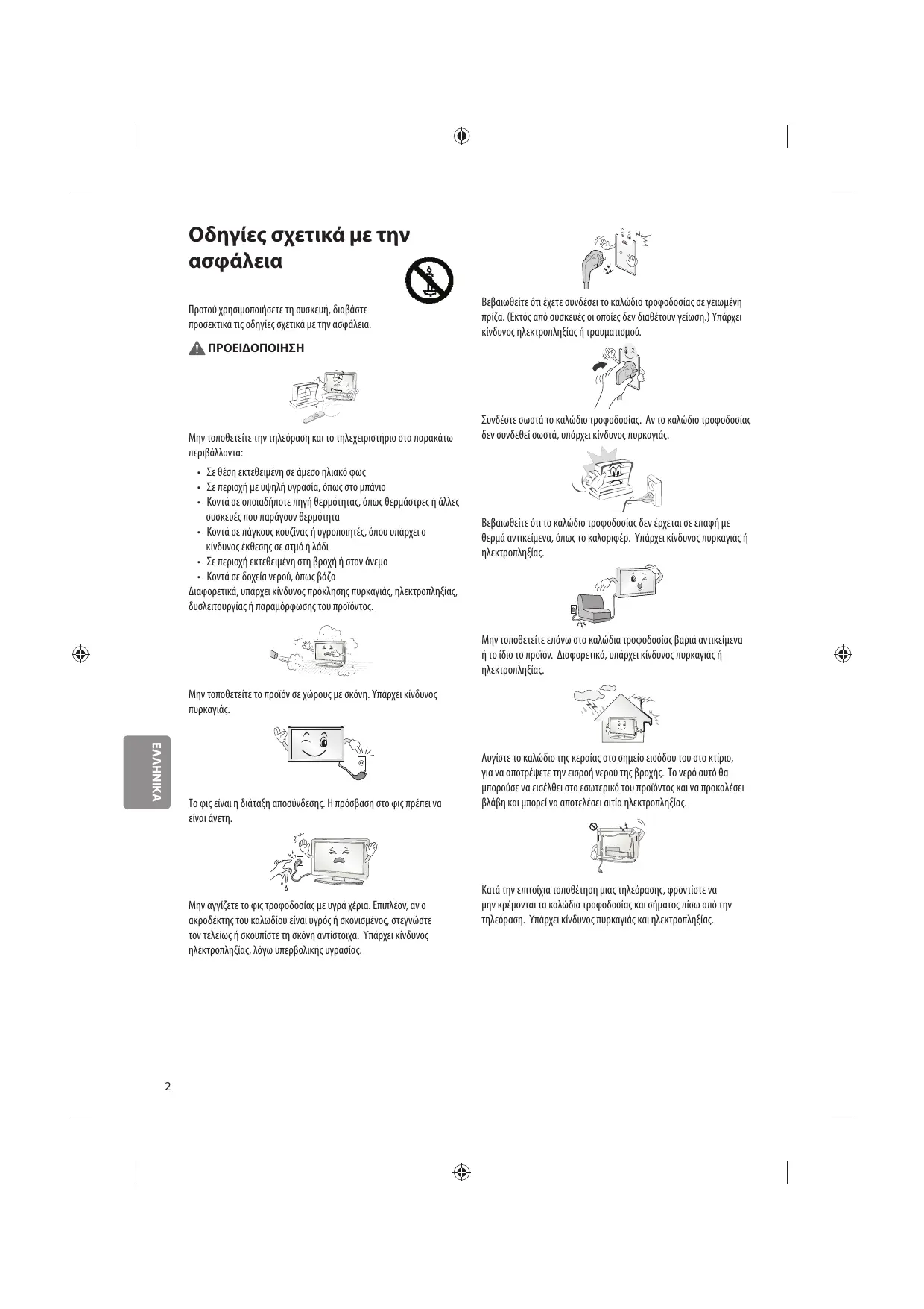 2000 (LH57**) 3000 (LH59**, LH60**, LH61**, LH63**) 75 Ω ǼīȋǼǿȇǿǻǿȅȋȇǾȈȉǾ ǹıijȐȜİȚĮțĮȚǹȞĮijȠȡȐ /('79 ǾIJȘȜİȩȡĮıȘ/('IJȘȢ/*įȚĮșȑIJİȚȠșȩȞȘ /&'ȝİijȦIJȚıȝȩ/(' ȆȡȚȞșȑıİIJİıİȜİȚIJȠȣȡȖȓĮIJȘıȣıțİȣȒįȚĮȕȐıIJİ ʌȡȠıİțIJȚțȐIJȠʌĮȡȩȞİȖȤİȚȡȓįȚȠțĮȚijȣȜȐȟIJİIJȠıİ ĮıijĮȜȑȢȝȑȡȠȢȖȚĮȝİȜȜȠȞIJȚțȒĮȞĮijȠȡȐ www.lg.com Οδηγίες σχετικά με την Προτού χρησιμοποιήσετε τη συσκευή, διαβάστε προσεκτικά τις οδηγίες σχετικά με την ασφάλεια. Βεβαιωθείτε ότι έχετε συνδέσει το καλώδιο τροφοδοσίας σε γειωμένη πρίζα. (Εκτός από συσκευές οι οποίες δεν διαθέτουν γείωση.) Υπάρχει κίνδυνος ηλεκτροπληξίας ή τραυματισμού. ΠΡΟΕΙΔΟΠΟΙΗΣΗ Μην τοποθετείτε την τηλεόραση και το τηλεχειριστήριο στα παρακάτω περιβάλλοντα: t Σε θέση εκτεθειμένη σε άμεσο ηλιακό φως t Σε περιοχή με υψηλή υγρασία, όπως στο μπάνιο t Κοντά σε οποιαδήποτε πηγή θερμότητας, όπως θερμάστρες ή άλλες συσκευές που παράγουν θερμότητα t Κοντά σε πάγκους κουζίνας ή υγροποιητές, όπου υπάρχει ο κίνδυνος έκθεσης σε ατμό ή λάδι t Σε περιοχή εκτεθειμένη στη βροχή ή στον άνεμο t Κοντά σε δοχεία νερού, όπως βάζα Διαφορετικά, υπάρχει κίνδυνος πρόκλησης πυρκαγιάς, ηλεκτροπληξίας, δυσλειτουργίας ή παραμόρφωσης του προϊόντος. Συνδέστε σωστά το καλώδιο τροφοδοσίας. Αν το καλώδιο τροφοδοσίας δεν συνδεθεί σωστά, υπάρχει κίνδυνος πυρκαγιάς. Βεβαιωθείτε ότι το καλώδιο τροφοδοσίας δεν έρχεται σε επαφή με θερμά αντικείμενα, όπως το καλοριφέρ. Υπάρχει κίνδυνος πυρκαγιάς ή ηλεκτροπληξίας. Μην τοποθετείτε επάνω στα καλώδια τροφοδοσίας βαριά αντικείμενα ή το ίδιο το προϊόν. Διαφορετικά, υπάρχει κίνδυνος πυρκαγιάς ή ηλεκτροπληξίας. Μην τοποθετείτε το προϊόν σε χώρους με σκόνη. Υπάρχει κίνδυνος