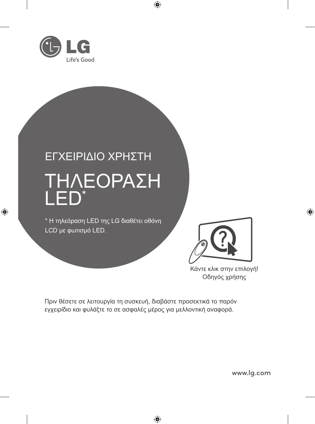- Η τηλεόραση LED της LG διαθέτει οθόνη LCD με φωτισμό LED. Κάντε κλικ στην επιλογή! Οδηγός χρήσης Πριν θέσετε σε λειτουργία τη συσκευή, διαβάστε προσεκτικά το παρόν εγχειρίδιο και φυλάξτε το σε ασφαλές μέρος για μελλοντική αναφορά. www.lg.com
