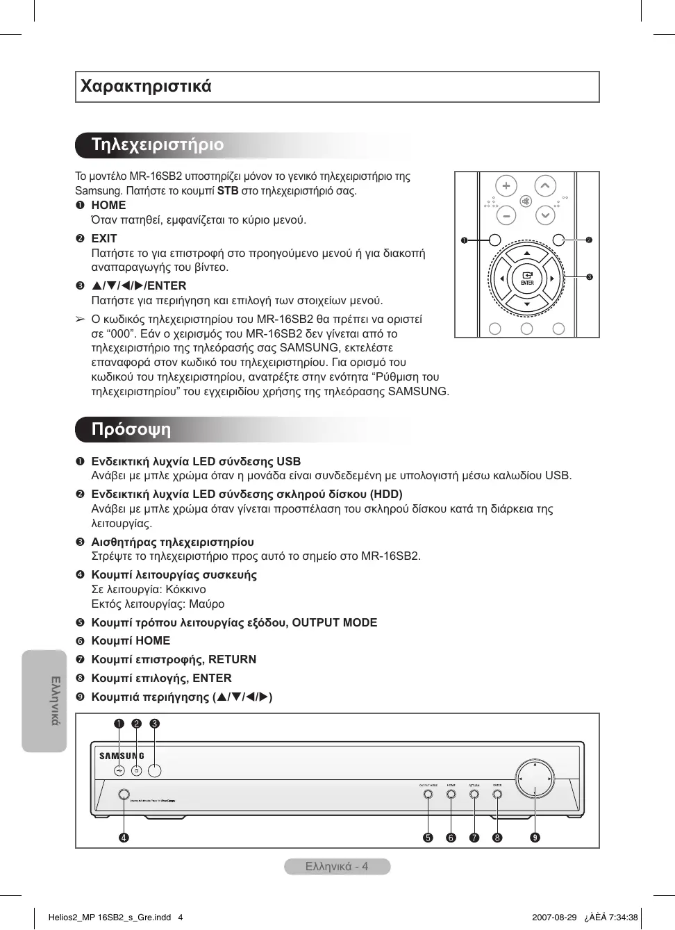 Πρόσοψη Ενδεικτική λυχνία LED σύνδεσης USB Ανάβει με μπλε χρώμα όταν η μονάδα είναι συνδεδεμένη με υπολογιστή μέσω καλωδίου USB. Ενδεικτική λυχνία LED σύνδεσης σκληρού δίσκου (HDD) Ανάβει με μπλε χρώμα όταν γίνεται προσπέλαση του σκληρού δίσκου κατά τη διάρκεια της λειτουργίας. Αισθητήρας τηλεχειριστηρίου Στρέψτε το τηλεχειριστήριο προς αυτό το σημείο στο MR-16SB2. Κουμπί λειτουργίας συσκευής Σε λειτουργία: Κόκκινο Εκτός λειτουργίας: Μαύρο Κουμπί τρόπου λειτουργίας εξόδου, OUTPUT MODE Κουμπί HOME Κουμπί επιστροφής, RETURN Ελληνικά