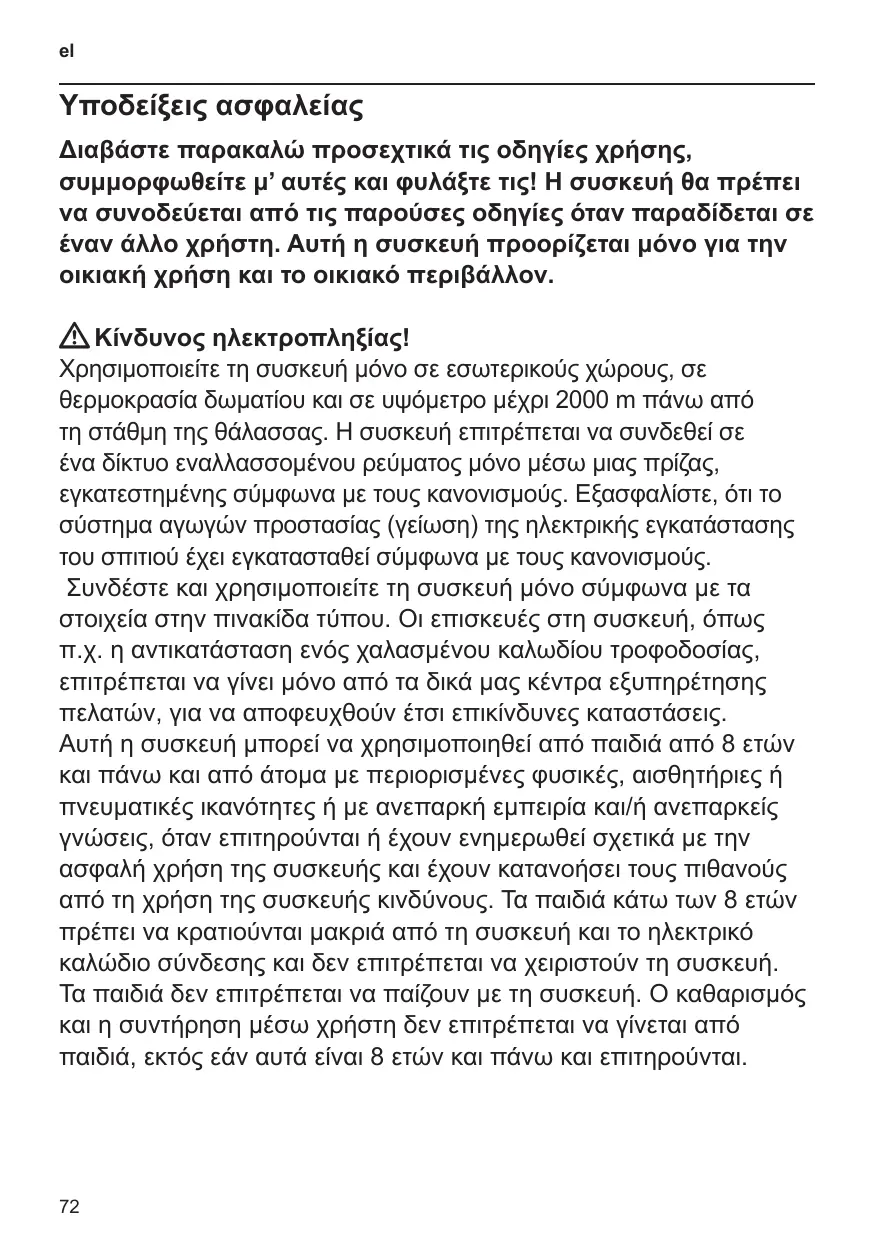 Υποδείξεις ασφαλείας Διαβάστε παρακαλώ προσεχτικά τις οδηγίες χρήσης, συμμορφωθείτε μ’ αυτές και φυλάξτε τις! Η συσκευή θα πρέπει να συνοδεύεται από τις παρούσες οδηγίες όταν παραδίδεται σε έναν άλλο χρήστη. Αυτή η συσκευή προορίζεται μόνο για την οικιακή χρήση και το οικιακό περιβάλλον. W Κίνδυνος ηλεκτροπληξίας! Χρησιμοποιείτε τη συσκευή μόνο σε εσωτερικούς χώρους, σε θερμοκρασία δωματίου και σε υψόμετρο μέχρι 2000 m πάνω από τη στάθμη της θάλασσας. Η συσκευή επιτρέπεται να συνδεθεί σε ένα δίκτυο εναλλασσομένου ρεύματος μόνο μέσω μιας πρίζας, εγκατεστημένης σύμφωνα με τους κανονισμούς. Εξασφαλίστε, ότι το σύστημα αγωγών προστασίας (γείωση) της ηλεκτρικής εγκατάστασης του σπιτιού έχει εγκατασταθεί σύμφωνα με τους κανονισμούς. Συνδέστε και χρησιμοποιείτε τη συσκευή μόνο σύμφωνα με τα στοιχεία στην πινακίδα τύπου. Οι επισκευές στη συσκευή, όπως π.χ. η αντικατάσταση ενός χαλασμένου καλωδίου τροφοδοσίας, επιτρέπεται να γίνει μόνο από τα δικά μας κέντρα εξυπηρέτησης πελατών, για να αποφευχθούν έτσι επικίνδυνες καταστάσεις. Αυτή η συσκευή μπορεί να χρησιμοποιηθεί από παιδιά από 8 ετών και πάνω και από άτομα με περιορισμένες φυσικές, αισθητήριες ή πνευματικές ικανότητες ή με ανεπαρκή εμπειρία και/ή ανεπαρκείς γνώσεις, όταν επιτηρούνται ή έχουν ενημερωθεί σχετικά με την ασφαλή χρήση της συσκευής και έχουν κατανοήσει τους πιθανούς από τη χρήση της συσκευής κινδύνους. Τα παιδιά κάτω των 8 ετών πρέπει να κρατιούνται μακριά από τη συσκευή και το ηλεκτρικό καλώδιο σύνδεσης και δεν επιτρέπεται να χειριστούν τη συσκευή. Τα παιδιά δεν επιτρέπεται να παίζουν με τη συσκευή. Ο καθαρισμός και η συντήρηση μέσω χρήστη δεν επιτρέπεται να γίνεται από παιδιά, εκτός εάν αυτά είναι 8 ετών και πάνω και επιτηρούνται.
