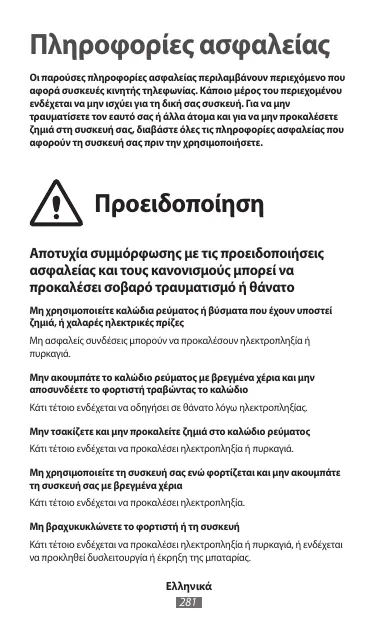 Πληροφορίες ασφαλείας Οι παρούσες πληροφορίες ασφαλείας περιλαμβάνουν περιεχόμενο που αφορά συσκευές κινητής τηλεφωνίας. Κάποιο μέρος του περιεχομένου ενδέχεται να μην ισχύει για τη δική σας συσκευή. Για να μην τραυματίσετε τον εαυτό σας ή άλλα άτομα και για να μην προκαλέσετε ζημιά στη συσκευή σας, διαβάστε όλες τις πληροφορίες ασφαλείας που αφορούν τη συσκευή σας πριν την χρησιμοποιήσετε. Προειδοποίηση Αποτυχία συμμόρφωσης με τις προειδοποιήσεις ασφαλείας και τους κανονισμούς μπορεί να προκαλέσει σοβαρό τραυματισμό ή θάνατο Μη χρησιμοποιείτε καλώδια ρεύματος ή βύσματα που έχουν υποστεί ζημιά, ή χαλαρές ηλεκτρικές πρίζες Μη ασφαλείς συνδέσεις μπορούν να προκαλέσουν ηλεκτροπληξία ή Μην ακουμπάτε το καλώδιο ρεύματος με βρεγμένα χέρια και μην αποσυνδέετε το φορτιστή τραβώντας το καλώδιο Κάτι τέτοιο ενδέχεται να οδηγήσει σε θάνατο λόγω ηλεκτροπληξίας. Μην τσακίζετε και μην προκαλείτε ζημιά στο καλώδιο ρεύματος Κάτι τέτοιο ενδέχεται να προκαλέσει ηλεκτροπληξία ή πυρκαγιά. Μη χρησιμοποιείτε τη συσκευή σας ενώ φορτίζεται και μην ακουμπάτε τη συσκευή σας με βρεγμένα χέρια Κάτι τέτοιο ενδέχεται να προκαλέσει ηλεκτροπληξία. Μη βραχυκυκλώνετε το φορτιστή ή τη συσκευή Κάτι τέτοιο ενδέχεται να προκαλέσει ηλεκτροπληξία ή πυρκαγιά, ή ενδέχεται να προκληθεί δυσλειτουργία ή έκρηξη της μπαταρίας.