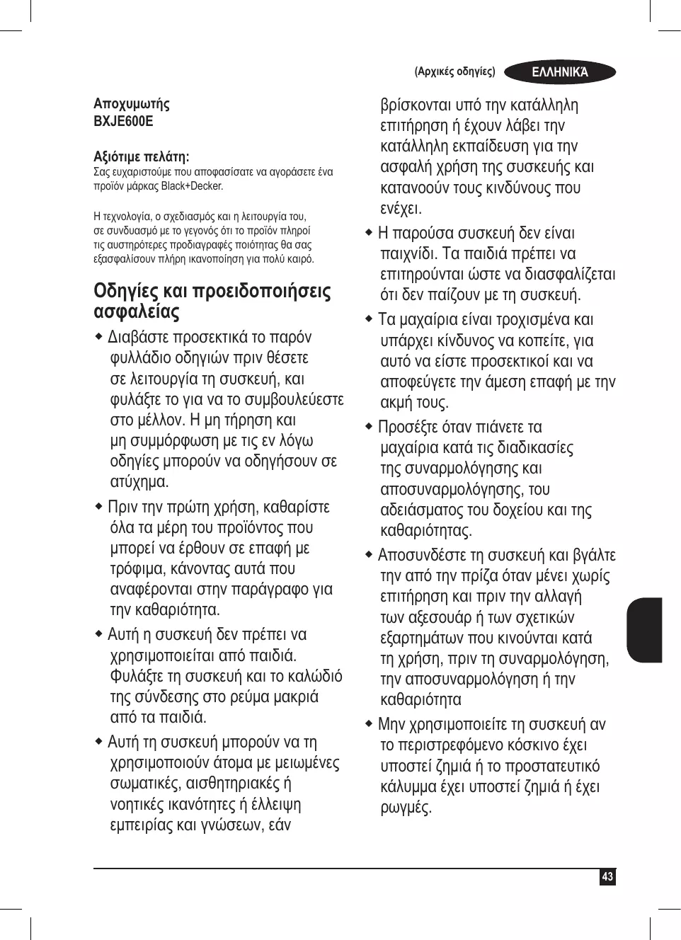 BXJE600E Αξιότιμε πελάτη: Σας ευχαριστούμε που αποφασίσατε να αγοράσετε ένα προϊόν μάρκας Black+Decker. Η τεχνολογία, ο σχεδιασμός και η λειτουργία του, σε συνδυασμό με το γεγονός ότι το προϊόν πληροί τις αυστηρότερες προδιαγραφές ποιότητας θα σας εξασφαλίσουν πλήρη ικανοποίηση για πολύ καιρό. Οδηγίες και προειδοποιήσεις