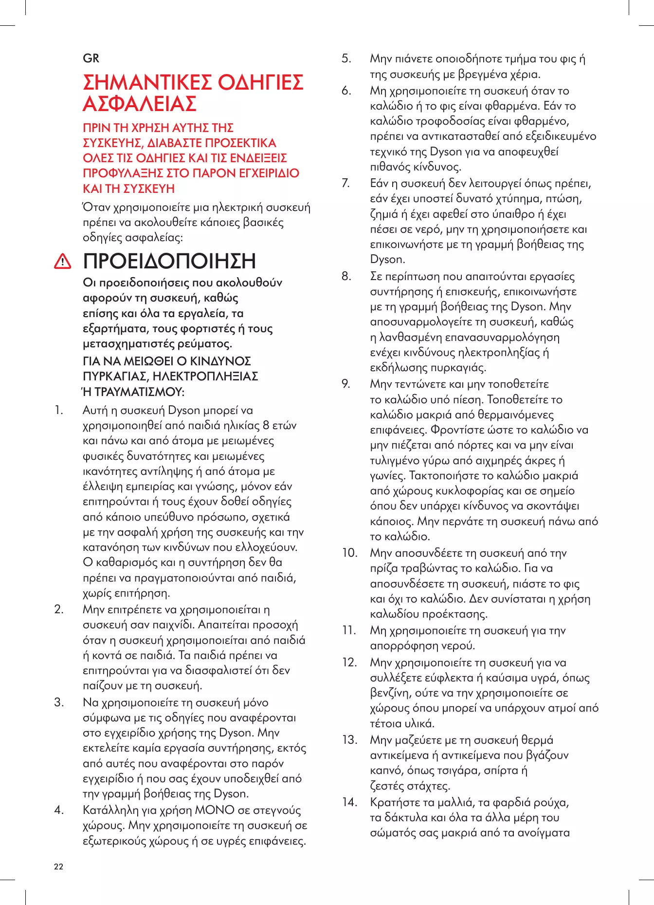 Cet appareil n’est pas un jouet et ne doit donc pas être utilisé comme tel. Une attention particulière est nécessaire lors de son utilisation par ou à proximité d’enfants. Il convient de surveiller les enfants pour s’assurer qu’ils ne jouent pas avec l’appareil. Utilisez l’appareil uniquement tel que décrit dans le manuel de l’utilisateur Dyson.N’effectuez pas de travaux d’entretien autres que ceux indiqués dans ce mode d’emploi Dyson ou que ceux conseillés par le Service consommateurs Dyson. Convient UNIQUEMENT à une utilisation dans des endroits secs. N’utilisez pas cet appareil en extérieur ou sur des surfaces humides. Ne manipulez aucune partie de la prise ou de l’appareil avec les mains mouillées. N’utilisez pas l’appareil si la prise ou le cordon sont endommagés. Si le cordon d’alimentation est endommagé, il doit être remplacé par Dyson, l'un de ses agents ou l'une des personnes agréées afin d’éviter tout danger. N’utilisez pas l’appareil s’il ne fonctionne pas conformément à ses spécifications, s’il a reçu un choc violent, s’il a subi une chute ou des dommages, s’il a été entreposé à l’extérieur ou s’il a été immergé dans l’eau. Contactez le Service consommateurs Dyson.