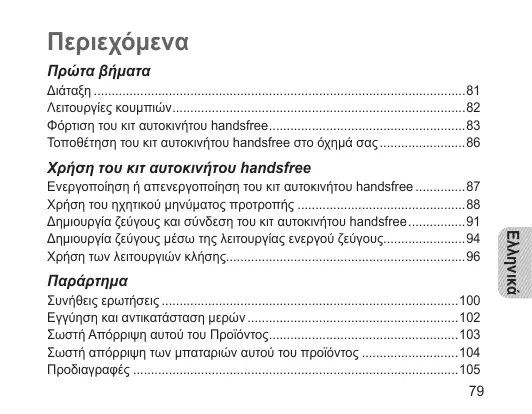 - Δημιουργία ζεύγους και σύνδεση του κιτ αυτοκινήτου handsfree p. 91
