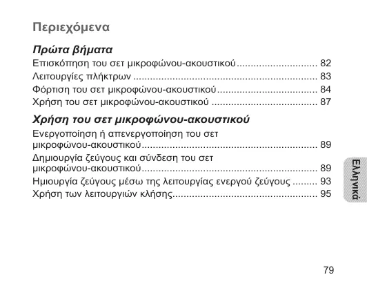 Ενεργοποίηση ή απενεργοποίηση του σετ μικροφώνου-ακουστικού 89 Δημιουργία ζεύγους και σύνδεση του σετ μικροφώνου-ακουστικού 89 ημιουργία ζεύγους μέσω της λειτουργίας ενεργού ζεύγους 93 Χρήση των λειτουργιών κλήσης 95