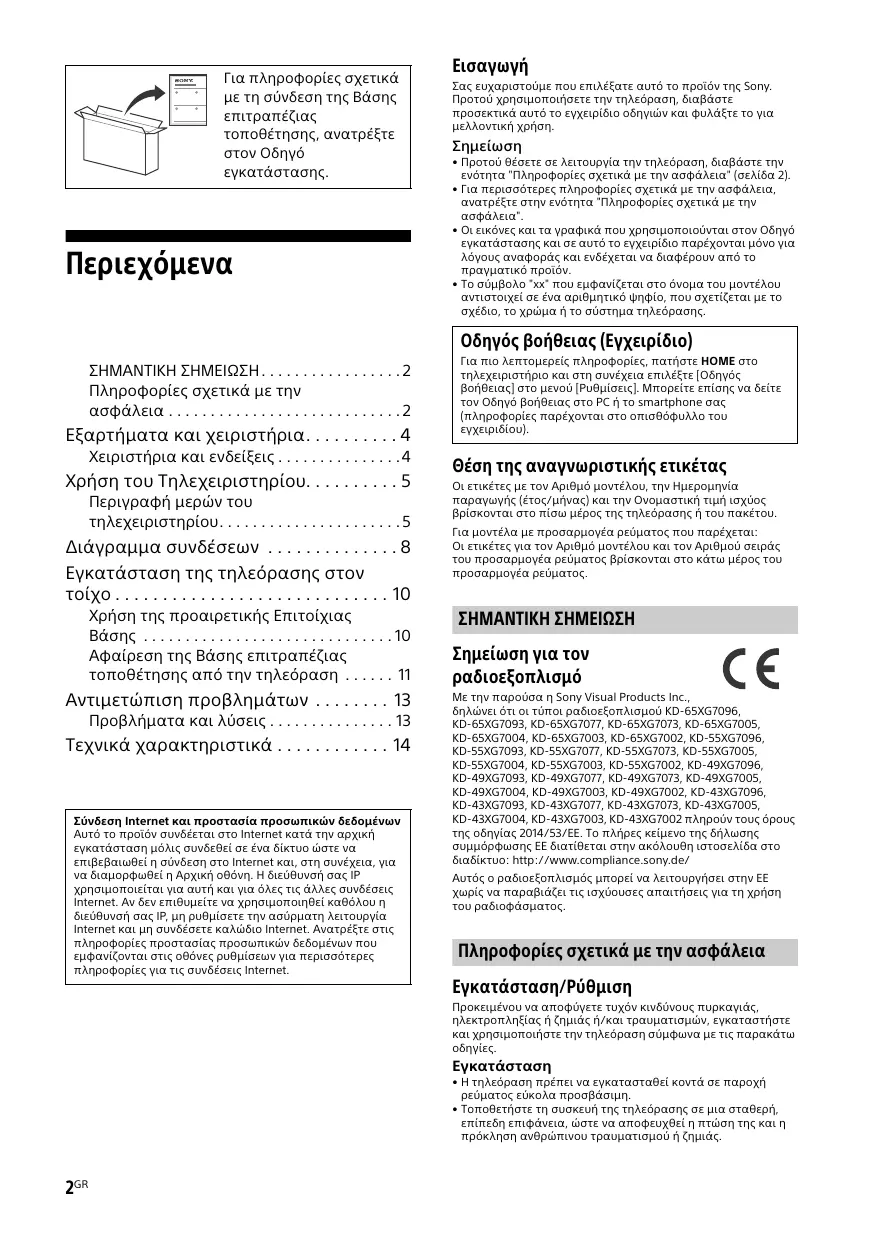 Le soussigné, Sony Visual Products Inc., déclare que les équipements radioélectriques de type KD-65XG7096, KD-65XG7093, KD-65XG7077, KD-65XG7073, KD-65XG7005, Installation/Mise en place Installez et utilisez le téléviseur conformément aux instructions ci-dessous afin d’éviter tout risque d’incendie, d’électrocution ou autre dommage et/ou blessure.