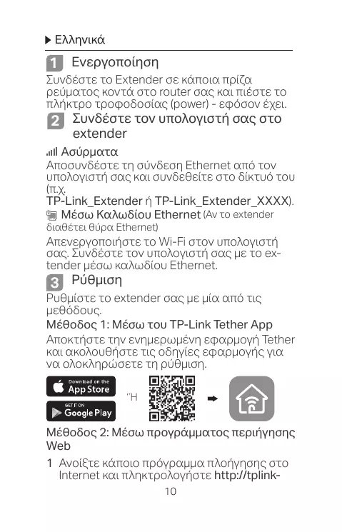 Αποσυνδέστε τη σύνδεση Ethernet από τον υπολογιστή σας και συνδεθείτε στο δίκτυό του TP-Link_Extender ή TP-Link_Extender_XXXX). Μέσω Καλωδίου Ethernet (Αν το extender διαθέτει θύρα Ethernet) Απενεργοποιήστε το Wi-Fi στον υπολογιστή σας. Συνδέστε τον υπολογιστή σας με το extender μέσω καλωδίου Ethernet. 3 Ρύθμιση Ρυθμίστε το extender σας με μία από τις Μέθοδος 1: Μέσω του TP-Link Tether App Αποκτήστε την ενημερωμένη εφαρμογή Tether και ακολουθήστε τις οδηγίες εφαρμογής για να ολοκληρώσετε τη ρύθμιση.
