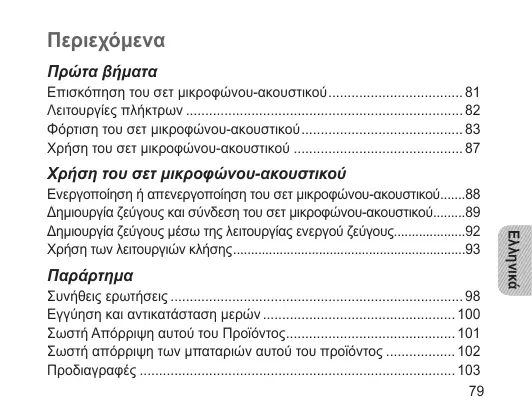 Συνήθεις ερωτήσεις 98 Εγγύηση και αντικατάσταση μερών 100 Σωστή Απόρριψη αυτού του Προϊόντος 101 Σωστή απόρριψη των μπαταριών αυτού του προϊόντος 102 Προδιαγραφές 103 79