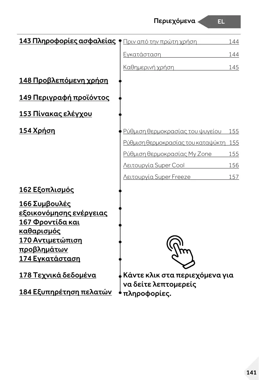 162 Εξοπλισμός 166 Συμβουλές εξοικονόμησης ενέργειας 167 Φροντίδα και καθαρισμός 170 Αντιμετώπιση προβλημάτων 174 Εγκατάσταση 178 Τεχνικά δεδομένα 184 Εξυπηρέτηση πελατών