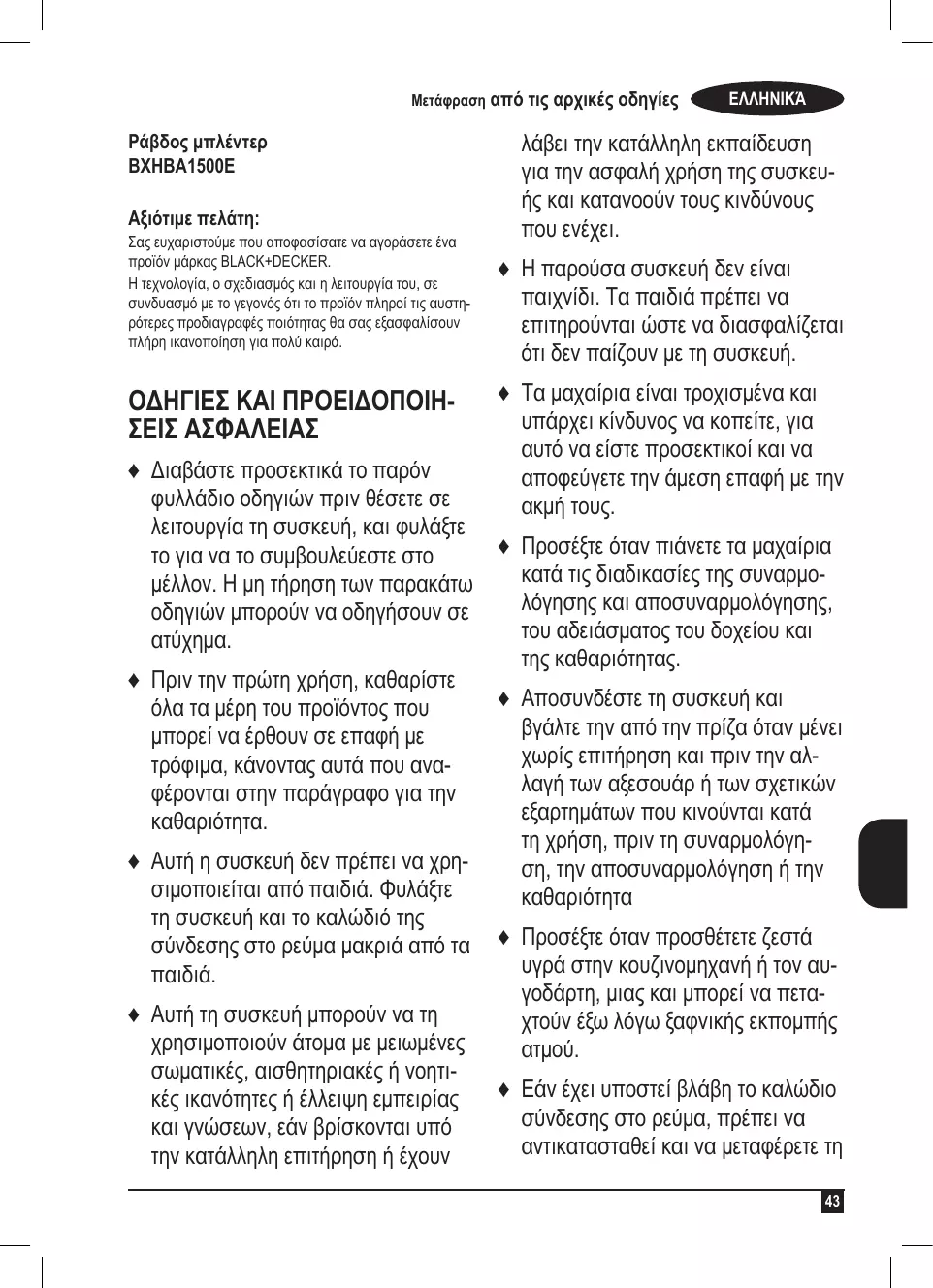 Μετάφραση από τις αρχικές οδηγίες Ράβδος μπλέντερ BXHBA1500E Αξιότιμε πελάτη: Σας ευχαριστούμε που αποφασίσατε να αγοράσετε ένα προϊόν μάρκας BLACK+DECKER. Η τεχνολογία, ο σχεδιασμός και η λειτουργία του, σε συνδυασμό με το γεγονός ότι το προϊόν πληροί τις αυστηρότερες προδιαγραφές ποιότητας θα σας εξασφαλίσουν πλήρη ικανοποίηση για πολύ καιρό. ΟΔΗΓΊΕΣ ΚΑΙ ΠΡΟΕΙΔΟΠΟΙΉΣΕΙΣ ΑΣΦΑΛΕΊΑΣ ♦♦ Διαβάστε προσεκτικά το παρόν φυλλάδιο οδηγιών πριν θέσετε σε λειτουργία τη συσκευή, και φυλάξτε το για να το συμβουλεύεστε στο μέλλον. Η μη τήρηση των παρακάτω οδηγιών μπορούν να οδηγήσουν σε ♦♦ Πριν την πρώτη χρήση, καθαρίστε όλα τα μέρη του προϊόντος που μπορεί να έρθουν σε επαφή με τρόφιμα, κάνοντας αυτά που αναφέρονται στην παράγραφο για την καθαριότητα. ♦♦ Αυτή η συσκευή δεν πρέπει να χρησιμοποιείται από παιδιά. Φυλάξτε τη συσκευή και το καλώδιό της σύνδεσης στο ρεύμα μακριά από τα ♦♦ Αυτή τη συσκευή μπορούν να τη χρησιμοποιούν άτομα με μειωμένες σωματικές, αισθητηριακές ή νοητικές ικανότητες ή έλλειψη εμπειρίας και γνώσεων, εάν βρίσκονται υπό την κατάλληλη επιτήρηση ή έχουν