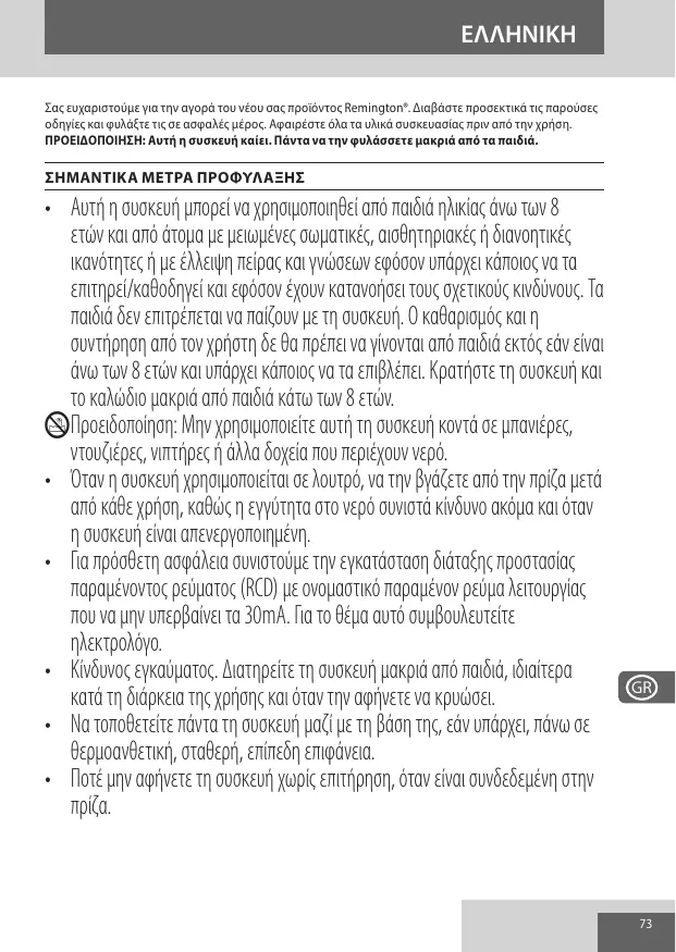 Tenez l’appareil et le câble hors de portée des enfants de moins de 8 ans. L Avertissement : Veillez à ne pas utiliser cet appareil à proximité de baignoires, douches, lavabos ou autres récipients contenant de l’eau. • Lorsque l’appareil est utilisé dans une salle de bains, débranchez-le après usage. La proximité de l’eau présente un danger même lorsque l’appareil est éteint. • Pour une protection supplémentaire, l’installation de courant résiduel (RCD)avec un differentiel residuel nominal ne dépassant pas 30mA est recommandée. Demandez de l’aide à un électricien. • Risque de brûlure. Veillez à maintenir l’appareil hors de portée des jeunes enfants, en particulier lorsque vous utilisez l’appareil et lorsqu’il refroidit. • Placez toujours l’appareil avec son support, le cas échéant, sur une surface plate, stable et résistante à la chaleur. • Ne laissez en aucun cas l’appareil sans surveillance quand il est connecté au réseau électrique. • Si le cordon d’alimentation de cet appareil est endommagé, cessez immédiatement d’utiliser l’appareil et renvoyez-le au service consommateurs Remington agréé le plus proche en vue de sa réparation ou de sa substitution afin d’éviter tout risque.