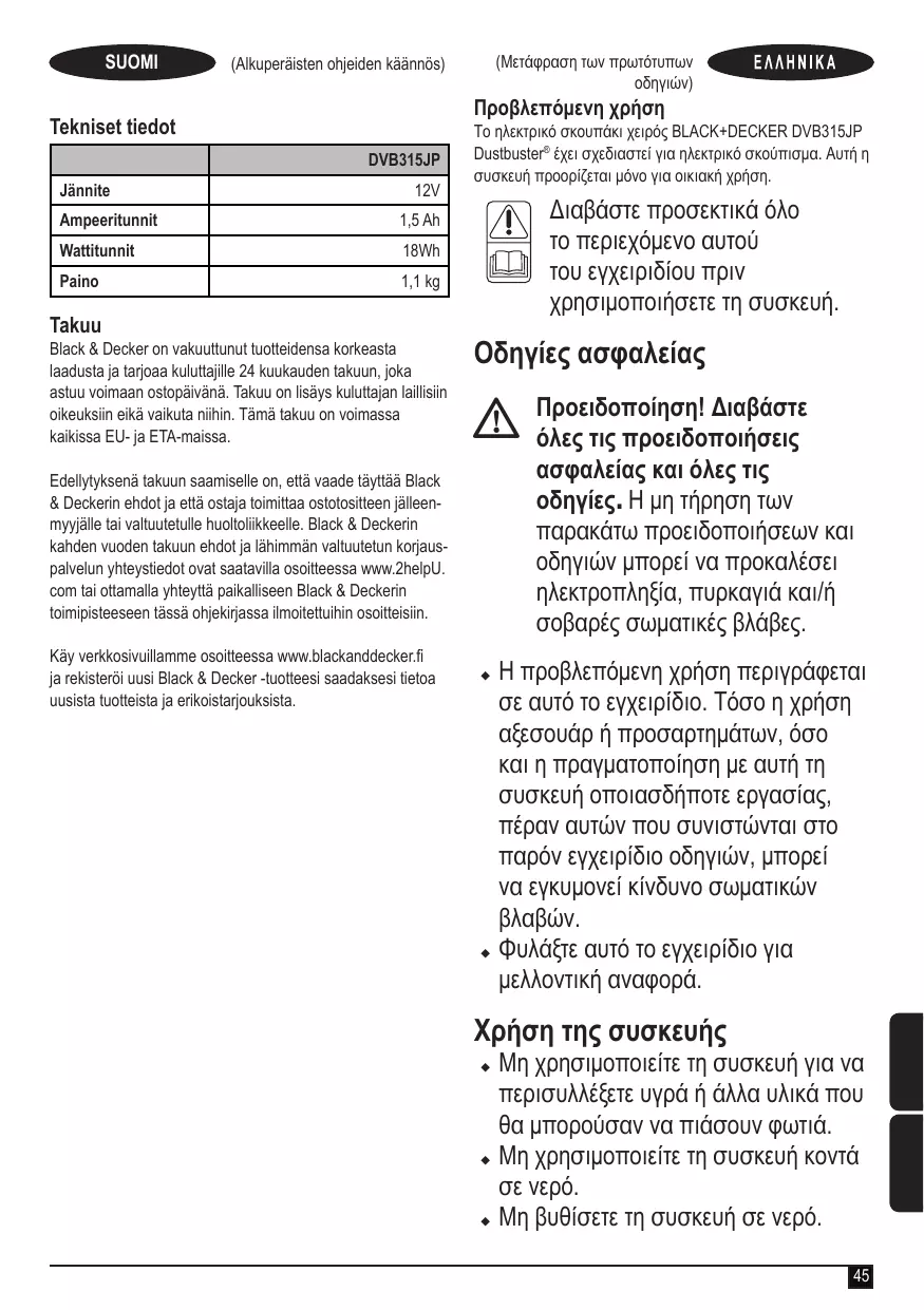 DVB315JP - Ηλεκτρική σκούπα BLACK & DECKER - Notice d'utilisation et mode d'emploi gratuit