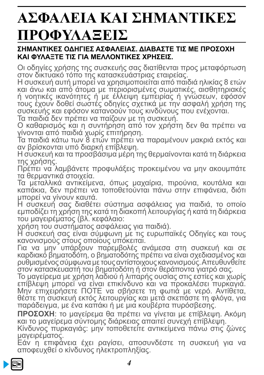 ΑΣΦΑΛΕΙΑ ΚΑΙ ΣΗΜΑΝΤΙΚΕΣ ΠΡΟΦΥΛΑΞΕΙΣ ΣΗΜΑΝΤΙΚΕΣ ΟΔΗΓΙΕΣ ΑΣΦΑΛΕΙΑΣ. ΔΙΑΒΑΣΤΕ ΤΙΣ ΜΕ ΠΡΟΣΟΧΗ ΚΑΙ ΦΥΛΑΞΤΕ ΤΙΣ ΓΙΑ ΜΕΛΛΟΝΤΙΚΕΣ ΧΡΗΣΕΙΣ. Οι οδηγίες χρήσης της συσκευής σας διατίθενται προς μεταφόρτωση στον δικτυακό τόπο της κατασκευάστριας εταιρείας. Η συσκευή αυτή μπορεί να χρησιμοποιείται από παιδιά ηλικίας 8 ετών και άνω και από άτομα με περιορισμένες σωματικές, αισθητηριακές ή νοητικές ικανότητες ή με έλλειψη εμπειρίας ή γνώσεων, εφόσον τους έχουν δοθεί σωστές οδηγίες σχετικά με την ασφαλή χρήση της συσκευής και εφόσον κατανοούν τους κινδύνους που ενέχονται. Τα παιδιά δεν πρέπει να παίζουν με τη συσκευή. Ο καθαρισμός και η συντήρηση από τον χρήστη δεν θα πρέπει να γίνονται από παιδιά χωρίς επιτήρηση. Τα παιδιά κάτω των 8 ετών πρέπει να παραμένουν μακριά εκτός και αν βρίσκονται υπό διαρκή επίβλεψη. Η συσκευή και τα προσβάσιμα μέρη της θερμαίνονται κατά τη διάρκεια της χρήσης. Πρέπει να λαμβάνετε προφυλάξεις προκειμένου να μην ακουμπάτε τα θερμαντικά στοιχεία. Τα μεταλλικά αντικείμενα, όπως μαχαίρια, πιρούνια, κουτάλια και καπάκια, δεν πρέπει να τοποθετούνται πάνω στην επιφάνεια, διότι μπορεί να γίνουν καυτά. Η συσκευή σας διαθέτει σύστημα ασφάλειας για παιδιά, το οποίο εμποδίζει τη χρήση της κατά τη διακοπή λειτουργίας ή κατά τη διάρκεια του μαγειρέματος (βλ. κεφάλαιο: χρήση του συστήματος ασφάλειας για παιδιά). Η συσκευή σας είναι σύμφωνη με τις ευρωπαϊκές Οδηγίες και τους κανονισμούς στους οποίους υπόκειται. Για να μην υπάρξουν παρεμβολές ανάμεσα στη συσκευή και σε καρδιακό βηματοδότη, ο βηματοδότης πρέπει να είναι σχεδιασμένος και ρυθμισμένος σύμφωνα με τους αντίστοιχους κανονισμούς. Απευθυνθείτε στον κατασκευαστή του βηματοδότη ή στον θεράποντα γιατρό σας. Το μαγείρεμα με χρήση λαδιού ή λιπαρής ουσίας στις εστίες και χωρίς επίβλεψη μπορεί να είναι επικίνδυνο και να προκαλέσει πυρκαγιά. Μην επιχειρήσετε ΠΟΤΕ να σβήσετε τη φωτιά με νερό. Αντίθετα, θέστε τη συσκευή εκτός λειτουργίας και μετά σκεπάστε τη φλόγα, για παράδειγμα, με ένα καπάκι ή με μια κουβέρτα πυρόσβεσης. ΠΡΟΣΟΧΗ: το μαγείρεμα θα πρέπει να γίνεται με επίβλεψη. Ακόμη και το μαγείρεμα σύντομης διάρκειας απαιτεί συνεχή επίβλεψη. Κίνδυνος πυρκαγιάς: μην τοποθετείτε αντικείμενα πάνω στις ζώνες μαγειρέματος. Εάν η επιφάνεια έχει ραγίσει, αποσυνδέστε τη συσκευή για να αποφευχθεί ο κίνδυνος ηλεκτροπληξίας.
