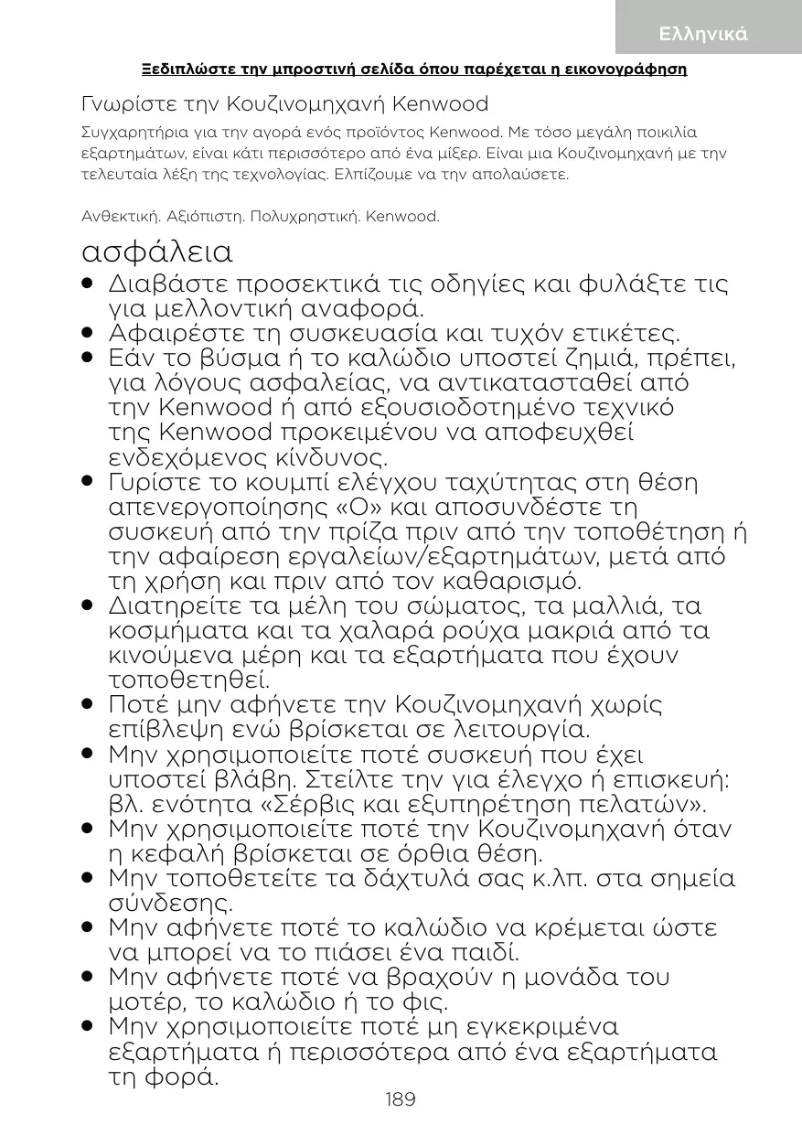 Lisez et conservez soigneusement ces instructions pour pouvoir vous y référer ultérieurement. O Retirez tous les éléments d’emballage et les étiquettes. O Si le cordon ou la prise sont endommagés, il faut les faire remplacer, pour des raisons de sécurité, par Kenwood ou un réparateur agréé par Kenwood pour éviter tout accident. O Mettez la commande de vitesse sur la position “ O “ OFF (Arrêt) et débranchez avant d’installer ou de retirer des ustensiles / accessoires, après utilisation et avant toute opération de nettoyage. O N’approchez pas des parties de votre corps, cheveux, bijoux ou vêtements amples des parties en mouvement et des accessoires installés. O Ne laissez jamais le robot pâtissier multifonction sans surveillance lorsqu’il fonctionne. O N’utilisez jamais un appareil endommagé. Faites-le vérifier ou réparer : reportez-vous à la rubrique “ Service après-vente “. O Ne faites jamais fonctionner votre robot pâtissier multifonction avec la tête en position levée. O Ne mettez pas les doigts dans le mécanisme de charnière. O Ne laissez jamais le cordon pendre de telle façon qu’un enfant puisse s’en saisir. O Veillez à ne jamais mouiller le bloc moteur, le cordon d’alimentation ou la prise. O N’utilisez jamais un accessoire non agréé ou plus d’un seul accessoire à la fois. O Ne dépassez jamais les quantités stipulées dans le tableau indiquant les quantités maximales. O