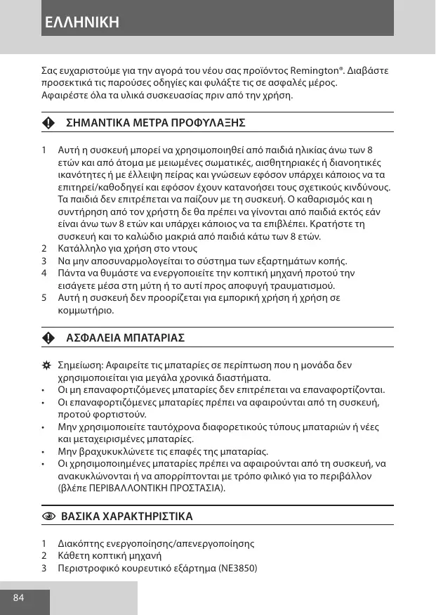 EΛΛHNIKH Σας ευχαριστούμε για την αγορά του νέου σας προϊόντος Remington®. Διαβάστε προσεκτικά τις παρούσες οδηγίες και φυλάξτε τις σε ασφαλές μέρος. Αφαιρέστε όλα τα υλικά συσκευασίας πριν από την χρήση.