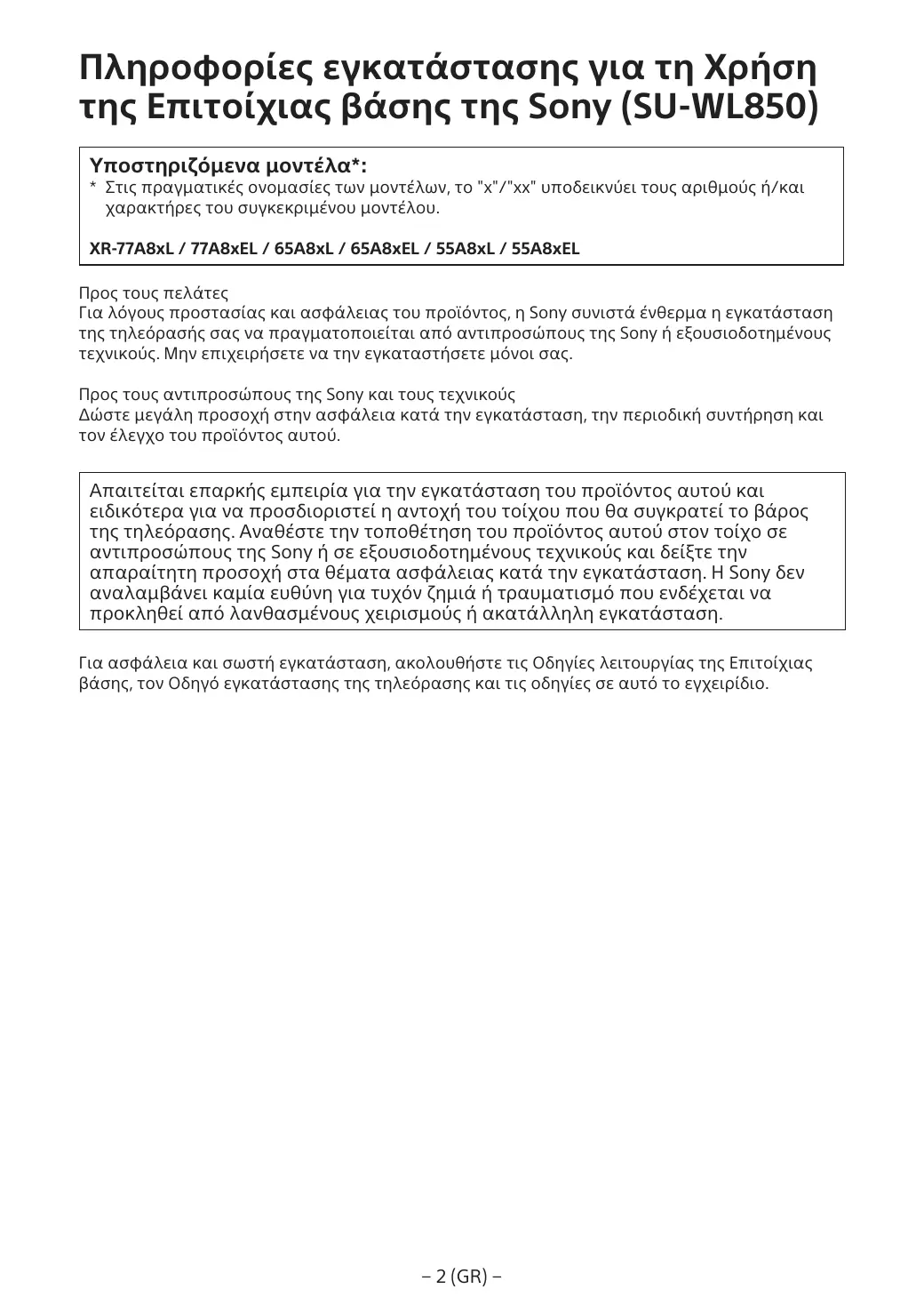 Pour des raisons de protection du produit et de sécurité, Sony recommande vivement que l’installation de votre téléviseur soit effectuée par un revendeur Sony ou un installateur agréé. N’essayez pas de l’installer vous-même. A l’attention des revendeurs et installateurs Sony Soyez particulièrement attentif à la sécurité pendant l’installation, l’entretien périodique et l’examen du produit.