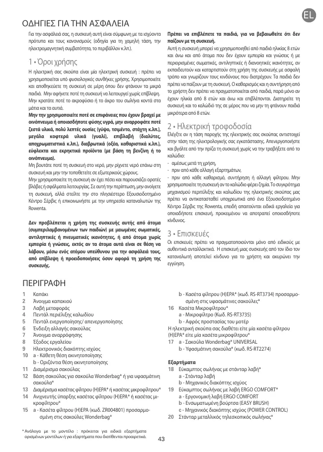 1 • Όροι χρήσης Η ηλεκτρική σας σκούπα είναι μία ηλεκτρική συσκευή : πρέπει να χρησιμοποιείται υπό φυσιολογικές συνθήκες χρήσης. Χρησιμοποιείτε και αποθηκεύετε τη συσκευή σε μέρη όπου δεν φτάνουν τα μικρά παιδιά. Μην αφήνετε ποτέ τη συσκευή να λειτουργεί χωρίς επίβλεψη. Μην κρατάτε ποτέ το ακροφύσιο ή το άκρο του σωλήνα κοντά στα μάτια και τα αυτιά. Μην την χρησιμοποιείτε ποτέ σε επιφάνειες που έχουν βραχεί με οινόπνευμα ή οποιασδήποτε φύσης υγρά, μην αναρροφάτε ποτέ ζεστά υλικά, πολύ λεπτές ουσίες (γύψο, τσιμέντο, στάχτη κ.λπ.), μεγάλα κοφτερά υλικά (γυαλί), επιβλαβή (διαλύτες, αποχρωματιστικά κ.λπ.), διαβρωτικά (οξέα, καθαριστικά κ.λπ.), εύφλεκτα και εκρηκτικά προϊόντα (με βάση τη βενζίνη ή το οινόπνευμα). Μη βουτάτε ποτέ τη συσκευή στο νερό, μην ρίχνετε νερό επάνω στη συσκευή και μην την τοποθετείτε σε εξωτερικούς χώρους. Μην χρησιμοποιείτε τη συσκευή αν έχει πέσει και παρουσιάζει ορατές βλάβες ή σφάλματα λειτουργίας. Σε αυτή την περίπτωση, μην ανοίγετε τη συσκευή, αλλά στείλτε την στο πλησιέστερο Εξουσιοδοτημένο Κέντρο Σέρβις ή επικοινωνήστε με την υπηρεσία καταναλωτών της Rowenta. Δεν προβλέπεται η χρήση της συσκευής αυτής από άτομα (συμπεριλαμβανομένων των παιδιών) με μειωμένες σωματικές, αντιληπτικές ή πνευματικές ικανότητες, ή από άτομα χωρίς εμπειρία ή γνώσεις, εκτός αν τα άτομα αυτά είναι σε θέση να λάβουν, μέσω ενός ατόμου υπεύθυνου για την ασφάλειά τους, από επίβλεψη ή προειδοποιήσεις όσον αφορά τη χρήση της συσκευής.