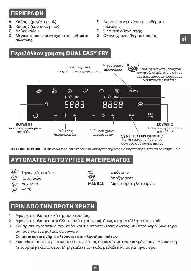 Περιβάλλον χρήστη DUAL EASY FRY Μη αυτόματο Προεπιλεγμένα προγράμματα μαγειρέματος πρόγραμμα