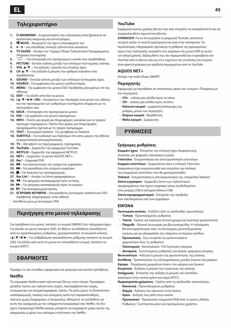 Από αυτό το μενού, μπορείτε να αλλάξετε το σήμα εισόδου της τηλεόρασης σε διαφορετική πηγή/συνδεμένη συσκευή. ΛΙΣΤΑ ΚΑΝΑΛΙΩΝ Για να ενεργοποιήσετε τη λίστα καναλιών, πατήστε το κουμπί [OK] ενώ παρακολουθείτε τηλεόραση. Αυτό σας επιτρέπει να επιλέξετε γρήγορα ένα κανάλι για παρακολούθηση – επιλέξτε το επιθυμητό κανάλι χρησιμοποιώντας τα βέλη πάνω και κάτω ή τα κουμπιά CH +/- στο τηλεχειριστήριο. Πατήστε [OK] για προβολή. Ενώ βρίσκεστε σε αυτό το μενού, μπορείτε να προβείτε στις ακόλουθες δύο επιλογές: Φιλτράρισμα καναλιών: πατήστε [INFO]: Αυτό σας επιτρέπει να φιλτράρετε τα κανάλια που εμφανίζονται στη λίστα καναλιών κατά τύπο. Επεξεργασία καναλιών: πατήστε [MENU]: Μεταβαίνοντας σε αυτή τη λειτουργία, μπορείτε να προσθέσετε κανάλια στη λίστα των αγαπημένων σας, να μετακινήσετε ή να παραλείψετε κανάλια. Χρησιμοποιήστε τα κουμπιά βέλους για να ορίσετε την επιλογή σας. Fav - προσθέστε ένα κανάλι στη λίστα αγαπημένων σας πατώντας το [OK] αφού φτάσετε στο επιθυμητό κανάλι. Πατήστε ξανά για αφαίρεση από τη λίστα αγαπημένων. Τα αγαπημένα μπορούν να επιλέγονται σε κανονική λειτουργία ψηφιακής τηλεόρασης πατώντας το κουμπί [FAV]. Διαγραφή - Οριστική διαγραφή καναλιού. Μπορεί να ανακτηθεί μόνο μέσω ανασυντονισμού. Για να επιλέξετε κανάλι για διαγραφή, πατήστε το κουμπί [OK]. Μετακίνηση - Μετακίνηση του επιλεγμένου καναλιού σε διαφορετική θέση. Πατήστε [OK] στο επιλεγμένο κανάλι και μετακινήστε το επιλεγμένο κανάλι με τα βέλη πάνω και κάτω στην επιθυμητή θέση. Πατήστε [OK] για επιβεβαίωση της νέας θέσης στη λίστα καναλιών. ΣΗΜΕΙΩΣΗ: Για να μετακινήσετε κανάλια, βεβαιωθείτε πως το μενού καναλιών είναι το "LCN" και πως έχει απενεργοποιηθεί η "Λίστα αυτόματης ενημέρωσης καναλιών". Παράλειψη - Στη λειτουργία ψηφιακής τηλεόρασης, και χρησιμοποιώντας τα κουμπιά CH +/-, το επιλεγμένο κανάλι θα παραλείπεται. Επιλέξτε ένα κανάλι για παράλειψη πατώντας το κουμπί [OK]. Για αναίρεση επιλογής, πατήστε ξανά το κουμπί [OK]. AQUOS NET+ Η πύλη AQUOS NET+ σας δίνει τη δυνατότητα να απολαμβάνετε ποικιλία εφαρμογών ή περιήγηση στον Ιστό από την τηλεόραση AQUOS LCD. Για πρόσβαση στο μενού AQUOS NET+ πατήστε το κουμπί NET+ στο τηλεχειριστήριο ή επιλέξτε το από το μενού Περισσότερες εφαρμογές της τηλεόρασης. ΣΗΜΕΙΩΣΗ: Περιμένετε λίγο για να συνδεθεί η τηλεόραση στο δίκτυο Wi-Fi. Αυτό μπορεί να διαρκέσει λίγα λεπτά μετά την ενεργοποίηση της τηλεόρασης. Περιηγηθείτε στο μενού χρησιμοποιώντας τα κουμπιά κύλισης ▲/▼/◄/►. Για να επιβεβαιώσετε την αναπαραγωγή/προβολή του επιθυμητού στοιχείου, πατήστε το κουμπί [OK]. Για μετάβαση προς τα πίσω 'ενός βήματος' πατήστε το κουμπί [Menu], ενώ για πρόσβαση σε επιπρόσθετες λειτουργίες χρησιμοποιήστε τα έγχρωμα κουμπιά. Για έξοδο από το AQUOS NET+ πατήστε το κουμπί [EXIT]. Αρχική - Αρχική οθόνη με συστηνόμενες ταινίες και εφαρμογές που άνοιξαν πρόσφατα Apps - Ανοίγει μια λίστα διαθέσιμων εφαρμογών Ταινίες - Ανοίγει μια λίστα διαθέσιμων ταινιών Τηλεοπτικές εκπομπές - Ανοίγει μια λίστα διαθέσιμων τηλεοπτικών εκπομπών Μουσική - Ανοίγει μια λίστα διαθέσιμης Μουσικής και Μουσικών βίντεο Παιχνίδια - Κατάλογος παιχνιδιών και εφαρμογών σχετικών με αυτά. Αθλητικά - Κατάλογος αθλητικών εφαρμογών. Ειδήσεις - Κατάλογος ειδησεογραφικών εφαρμογών. Αναζήτηση - αναζήτηση εφαρμογών εισάγοντας το όνομα ή τμήμα του ονόματος των εφαρμογών. Οι εφαρμογές μου - Προσθέτοντας εφαρμογές στον κατάλογο “Οι εφαρμογ