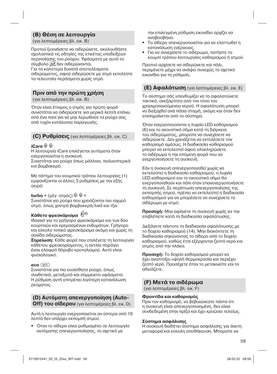(Pour plus de détails, voir fig. B) Avant de commencer le repassage, respectez soigneusement les instructions figurant sur l’étiquette d’entretien du vêtement. Les tissus présentant ce symbole ne peuvent pas être repassés. Pour un meilleur résultat, après un repassage à la vapeur, terminez le repassage sans vapeur.