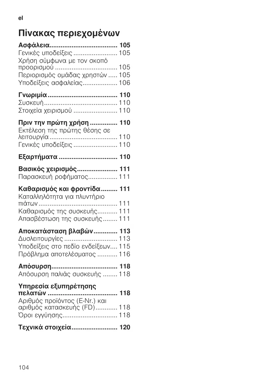 Πίνακας περιεχομένων Ασφάλεια 105 Γενικές υποδείξεις 105 Χρήση σύμφωνα με τον σκοπό προορισμού 105 Περιορισμός ομάδας χρηστών 105 Υποδείξεις ασφαλείας 106 Γνωριμία 110 Συσκευή 110 Στοιχεία χειρισμού 110 Πριν την πρώτη χρήση 110 Εκτέλεση της πρώτης θέσης σε λειτουργία 110 Γενικές υποδείξεις 110 Εξαρτήματα 110 Βασικός χειρισμός 111 Παρασκευή ροφήματος 111 Καθαρισμός και φροντίδα 111 Καταλληλότητα για πλυντήριο πιάτων 111 Καθαρισμός της συσκευής 111 Απασβέστωση της συσκευής 111 Αποκατάσταση βλαβών 113 Δυσλειτουργίες 113 Υποδείξεις στο πεδίο ενδείξεων.... 115 Πρόβλημα αποτελέσματος 116 Απόσυρση 118 Απόσυρση παλιάς συσκευής 118 Υπηρεσία εξυπηρέτησης πελατών 118 Αριθμός προϊόντος (E-Nr.) και αριθμός κατασκευής (FD) 118 Όροι εγγύησης 118 Τεχνικά στοιχεία 120